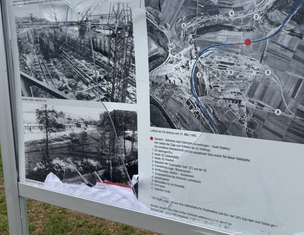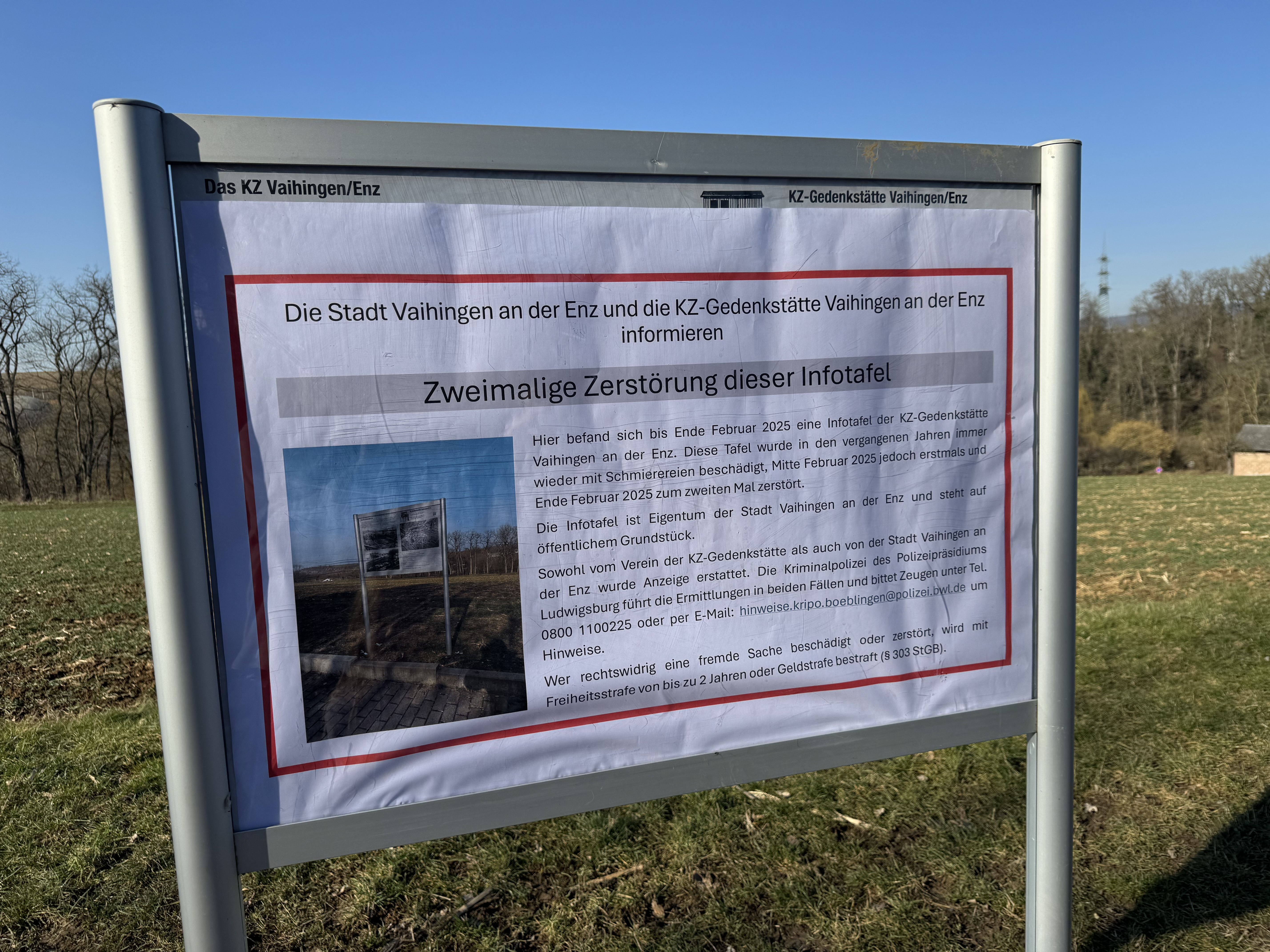 Das Team der Gedenkstätte hat daraufhin in Zusammenarbeit mit dem Bauhof ein Plakat mit einem Zeugenaufruf in den Rahmen der Infotafel gehängt und hinter einer dicken Plexiglasscheibe gesichert. Diese ist nun zerschlagen und das Plakat zerrissen beziehungsweise entfernt worden.
