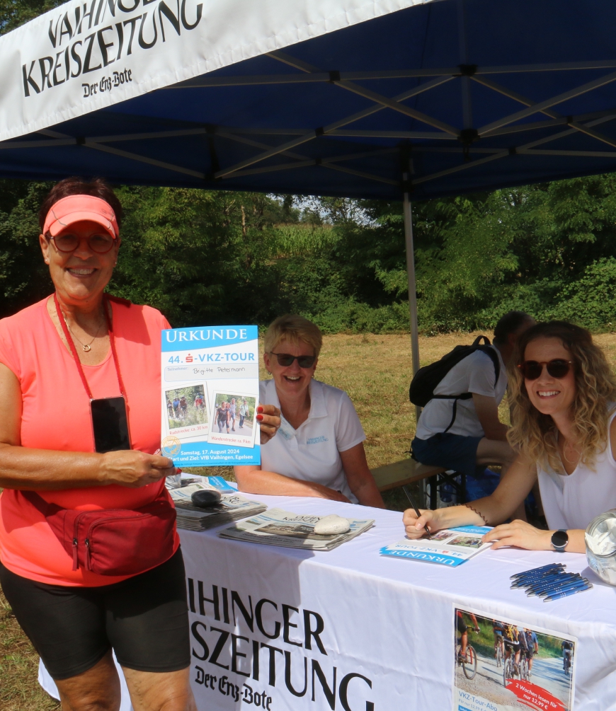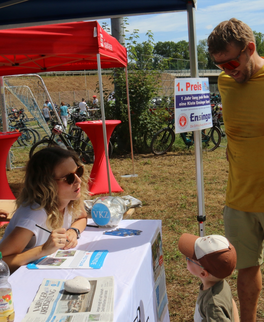 Auch die Teilnehmerurkunden am Stand der VKZ sind wieder beliebt. Brigitte Petermann aus Oberriexingen hängt sich diese später an die Wand. Es sei super gewesen, sie könnte gerade nochmal starten, „ich sitze das auf einer Arschbacke ab“, meint die Radlerin, die schon beim Oberriexinger Stadtradeln für mehr als 1000 Kilometer geehrt worden sei. Der zweijährige Lenn Schwarz aus Sersheim bekommt auch ein Dokument. Er ist im Anhänger bei Papa Pascal mitgefahren, der bestimmt schon zum 20. Mal dabei war. „Tolle Streckenführung“, lobt dieser.