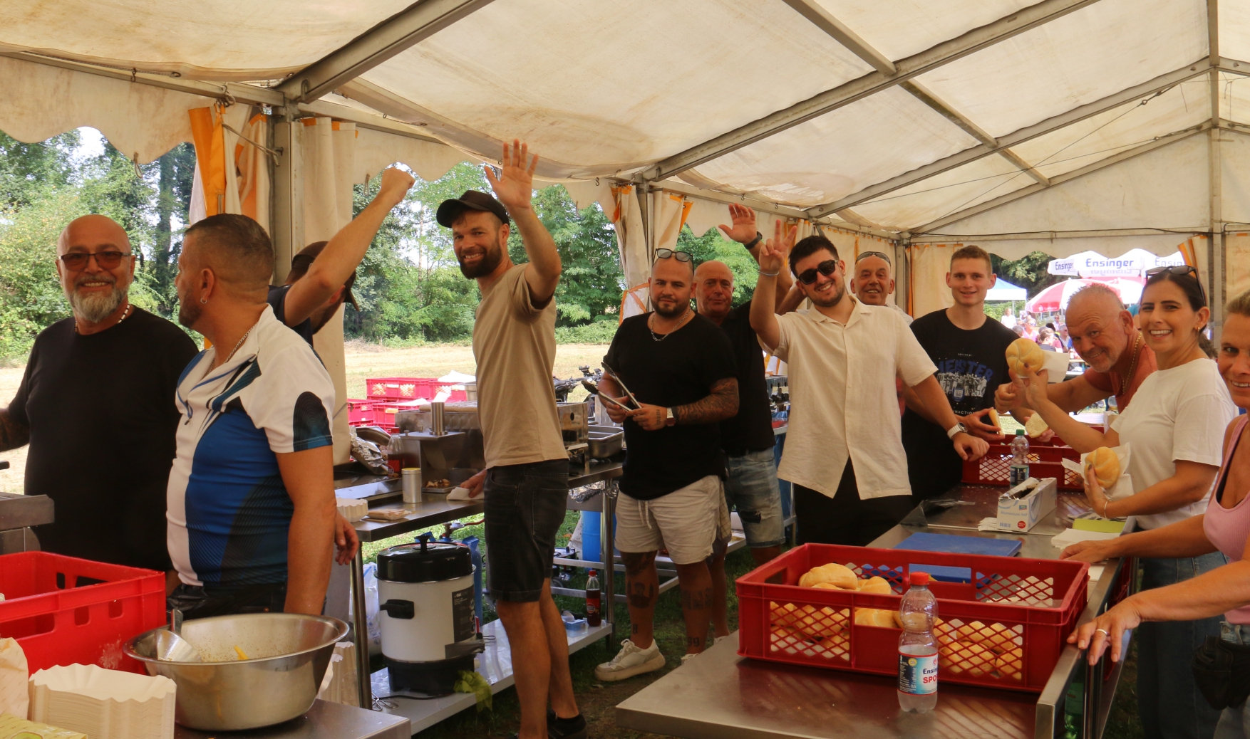 Zum dritten Mal fand die Tour-Hocketse beim VfB Vaihingen statt. Auf der Wiese neben dem Sportplatz warten rund 20 Helfer des Vereins auf die Wanderer und Radler, sagt der 1. Vorstand „Aki“ Elefterios Kalpakidis. „Bis jetzt klappt es von unserer Seite super“, meint der Vereinschef. Rote, Curry Wurst, Pommes, Schweine- und Putensteak, vegane Frikadellen, Kaffee, Kuchen und Getränke sind im Angebot. Weizenbier gebe es nicht, weil der Aufwand mit Schankanlage und Gläser für diese drei Stunden zu groß sei, so Kalpakidis.