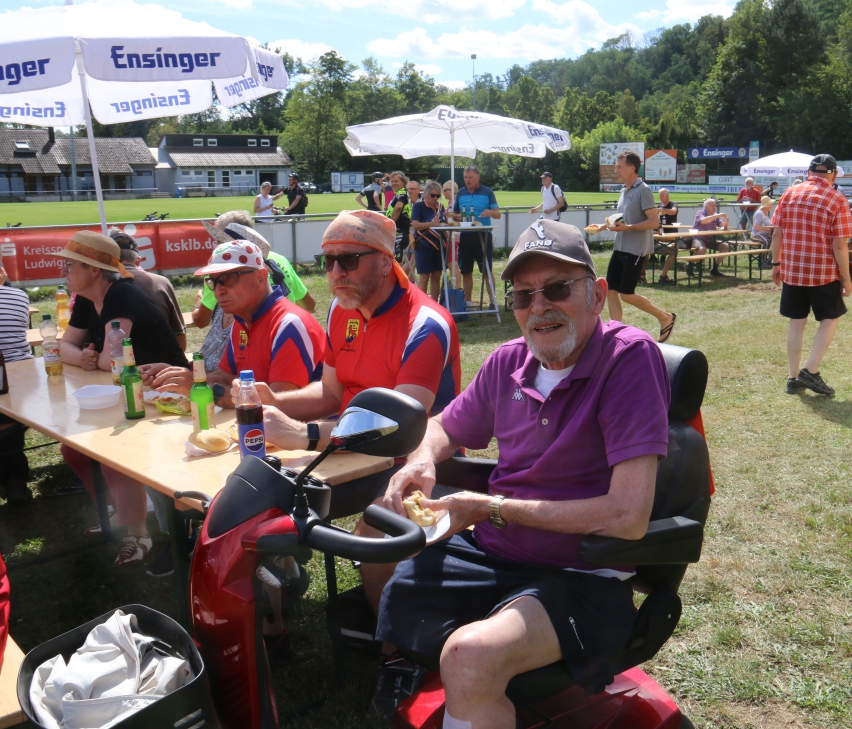 Das Zelt stand schon, weil unter anderem der Stadtpokal und Enz-Cup dort stattgefunden hatten. Von den Gästen gibt es Lob aber auch Kritik. Beispielsweise seien die Wurst und die Veggie-Frikadelle prima, allerdings ist so manchem das Bierfläschchen bei der Hitze zu klein und Schatten ist etwas rar. Auch bilden sich trotz der zwei Kassen Schlangen. Doch beispielsweise Rainer Helmecke aus Kleinglattbach schmeckt die Wurst. Er ist mit seinem Elektrorollstuhl bei den Wanderern mitgefahren. Es habe ein paar Stellen gegeben, die etwas holprig waren, aber „ansonsten war es eine wunderschöne Landschaft“. Das erste Stück an der Enz entlang sei fast das Schönste gewesen – und der Ausblick auf Vaihingen und Schloss Kaltenstein von der Auricher Höhe aus. Radler Rainer Kocher aus Eberdingen fährt gerade bei der Hocketse ein. „Es war schön, bis auf die lange Strecke von Roßwag nach Großglattbach“, das sei sehr „schotterig“ gewesen und immer bergauf gegangen, meint er.