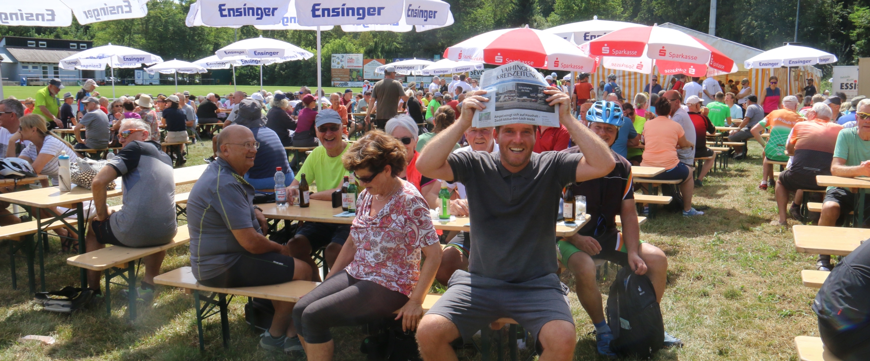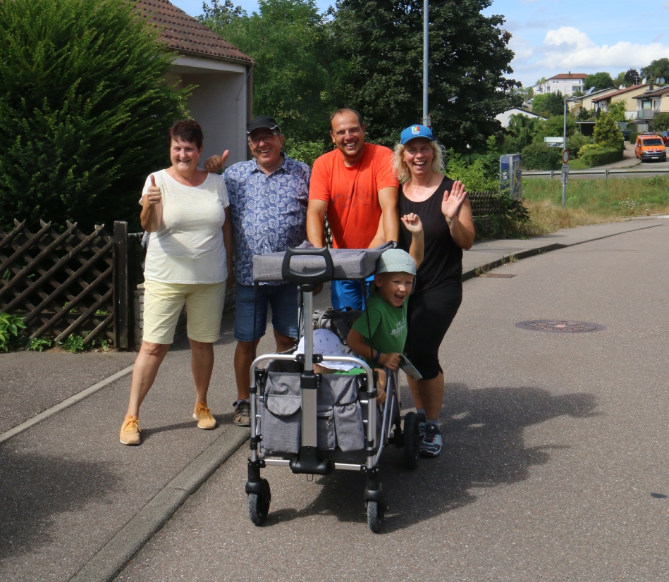 Ahmet Tavukcu stehen noch vor der Hocketse bei der Wanderung in Aurich die Schweißperlen auf der Stirn, denn er schiebt die Söhne Max und Felix im modernen Bollerwagen die Alte Vaihinger Steige hinauf. Bis auf den Buckel sei’s okay, scherzt er. Auch die Familie Tavukcu aus Enzweihingen kommt mit den Großeltern aus Vaihingen gut bei der Hocketse an – wie alle Tourteilnehmer. Bis auf zwei oder drei Schürfwunden habe DRK, Feuerwehr und Polizei keine Zwischenfälle oder Verletzungen verzeichnet, vermeldet Verlagsleiter Volker Blessing bei der Hocketse, gepaart mit dem Dank an die zahlreichen Helfer und Sponsoren. Mit Nachmeldung des Landtagsabgeordneten Konrad Epple sei die Gesamtzahl der Teilnehmer auf 609 gestiegen – 471 Radler und 138 Wanderer. Er habe mit ein paar Leuten mehr gerechnet, aber die Spitzenzahlen wie 1993 in Oberriexingen mit 1351 Teilnehmern – die höchste und „magische“ Zahl – „werden wir wohl nicht mehr erreichen“, so Blessing. Aber: „Schön, dass Sie da sind, und sich die Zeit genommen haben“,sagt Blessing zu den Teilnehmerinnen und Teilnehmern. Auch das Pannenfahrzeug mit Martin Fischer von Zweirad-Fischer habe nichts zu tun gehabt, so der Verlagsleiter. Aber VKZ-Hausmeister Walter Schneider vom Besenwagen des Radlertrosses berichtet von zwei jungen Teilnehmern, die schließlich ab Iptingen mit der Feuerwehr mitfahren durften, was dann letztendlich auch eine Gaudi war.