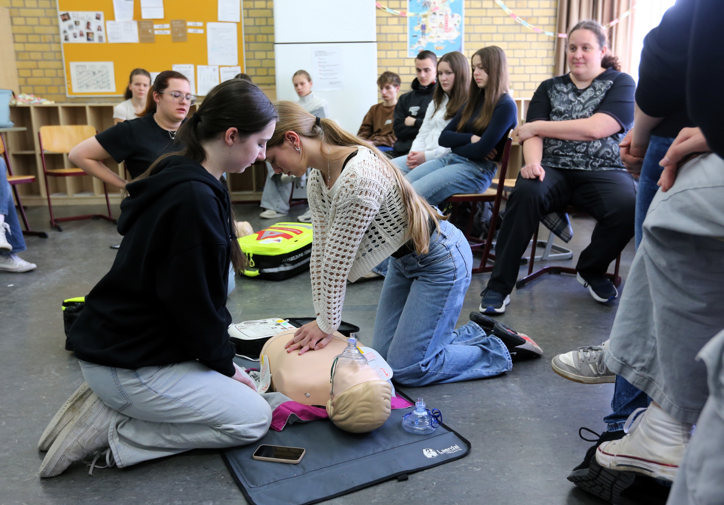 Vaihingen. „Dong-dong-dong-dong.“ Der Defibrillator gibt den Takt vor, in dem die Herzdruckmassage durchgeführt werden soll. Mit einem halben Ohr lauschen die Neunt- und Zehntklässler dem Taktgeber, doch eigentlich sind sie voll darauf fokussiert, den Brustkorb der Übungspuppe rund zwei Mal pro…
