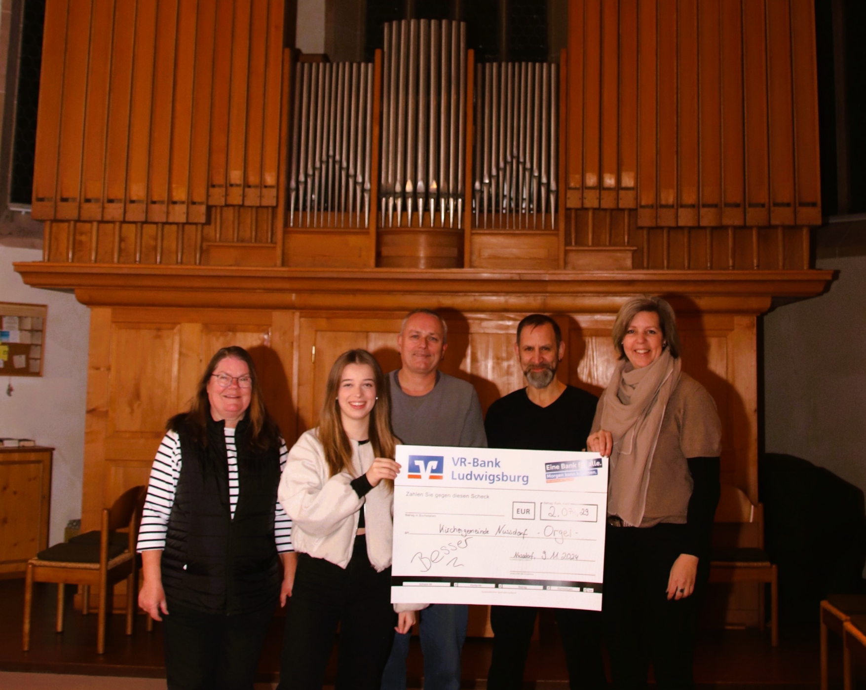 Das Benefiz-Konzert von Besser live in Nussdorf bringt einen Reinerlös von mehr als 2000 Euro. Da freut man sich vor der Kirchenorgel über die Unterstützung. Von links: Kirchenpflegerin Renate Grauel, Musikerin Helena Hein-Talmon, Markus Rößle und Steffen Kazda von Besser, Petra Schurr, Vorsitzende des Kirchengemeinderates. Foto: Arning