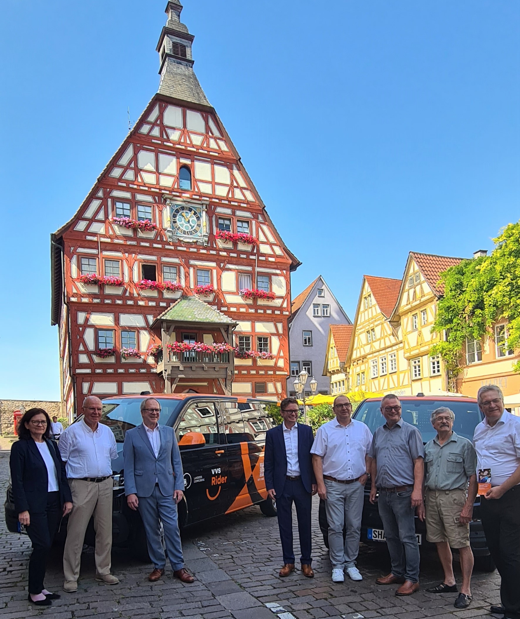 Gruppenbild mit Bussen vor dem Besigheimer Rathaus (von links): Birgit Stoib (Friedrich Müller Omnibus Verkehre), Bürgermeister Martin Bernhard (Tamm), Erster Landesbeamte Jürgen Vogt, Bürgermeister Florian Bargmann (Besigheim), Bürgermeister Uwe Seibold (Kirchheim), Bürgermeister Jörg Frauhammer (Gemmrigheim), stellvertretender Bürgermeister Wilhelm Weiss (Walheim) und VVS-Geschäftsführer Thomas Hachenberger. Foto: Kauer