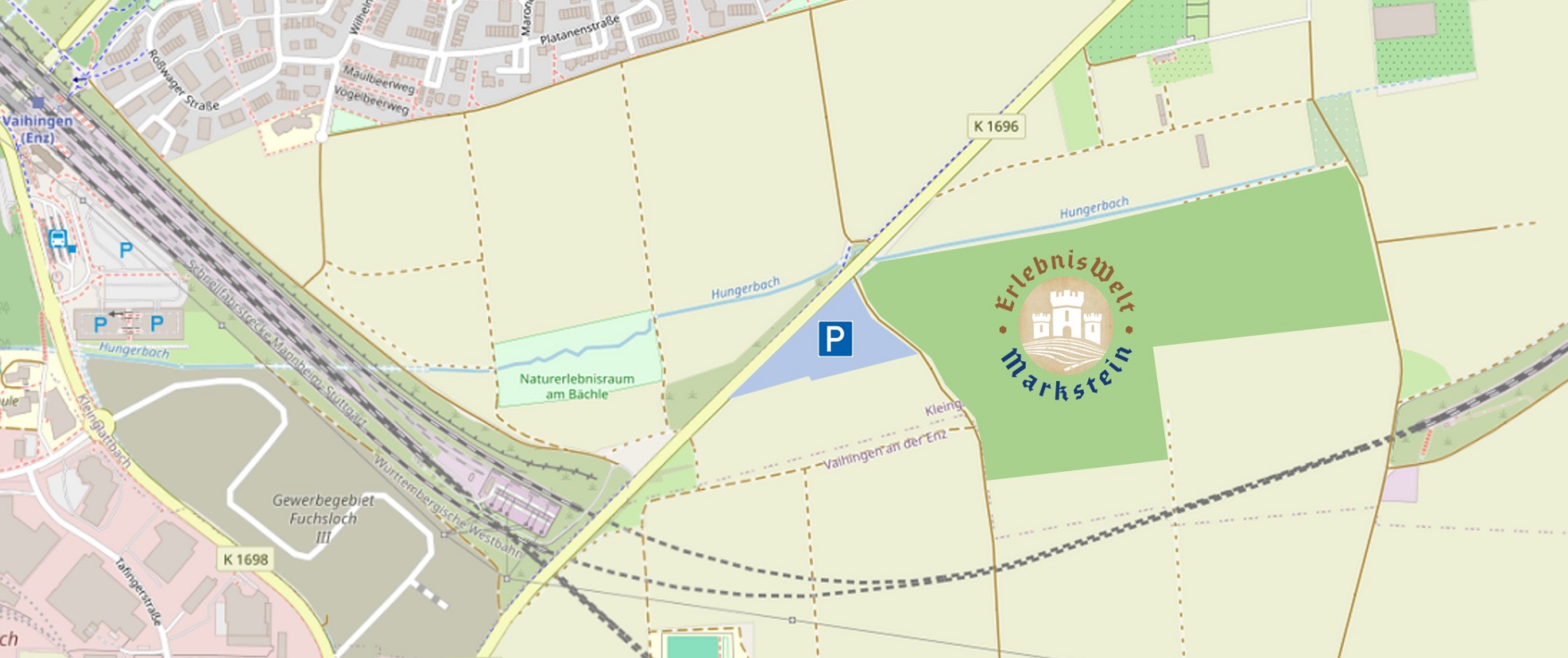 An der Kreisstraße 1696: Auf dieser Fläche (grün) ist die Erlebniswelt geplant, es schließt sich direkt ein Parkplatz (blau) an. Quelle: OpenStreetMap, angepasst durch Epic Realms Ventures