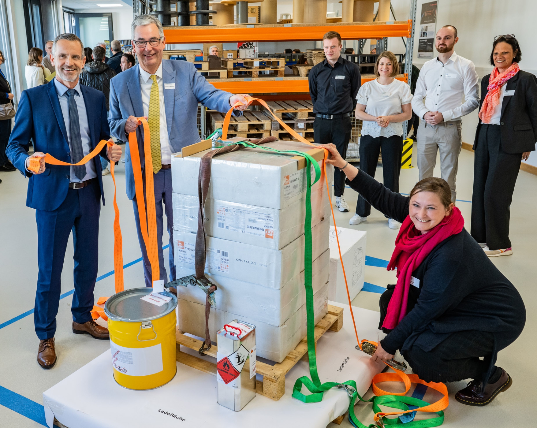 Schulleiter Oliver Schmider, Landrat Dietmar Allgaier und Miriam Bädker, Abteilungsleiterin der Berufsschule und Fachbereichsleiterin Lager, (im Vordergrund von links) nehmen das neue Übungslager der Erich-Bracher-Schule in Betrieb. Foto: Landratsamt