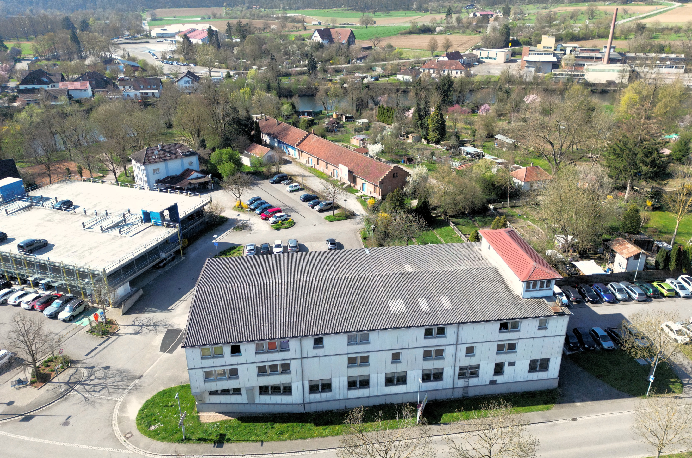 Hier wird sich in den nächsten Jahren einiges ändern: Das Enßle-Gebäude (vorne) wird abgerissen, Gleiches gilt für das Gebäude der Griechischen Gemeinschaft (links hinter dem Parkhaus). Der Pferdestall hingegen (Backsteingebäude in der Bildmitte) soll erhalten bleiben. Die angrenzenden Bürgergärten sowie das Häcker-Areal (andere Flussseite, rechts hinten im Bild) spielen bei der Gartenschau eine große Rolle. Archivfoto: Küppers