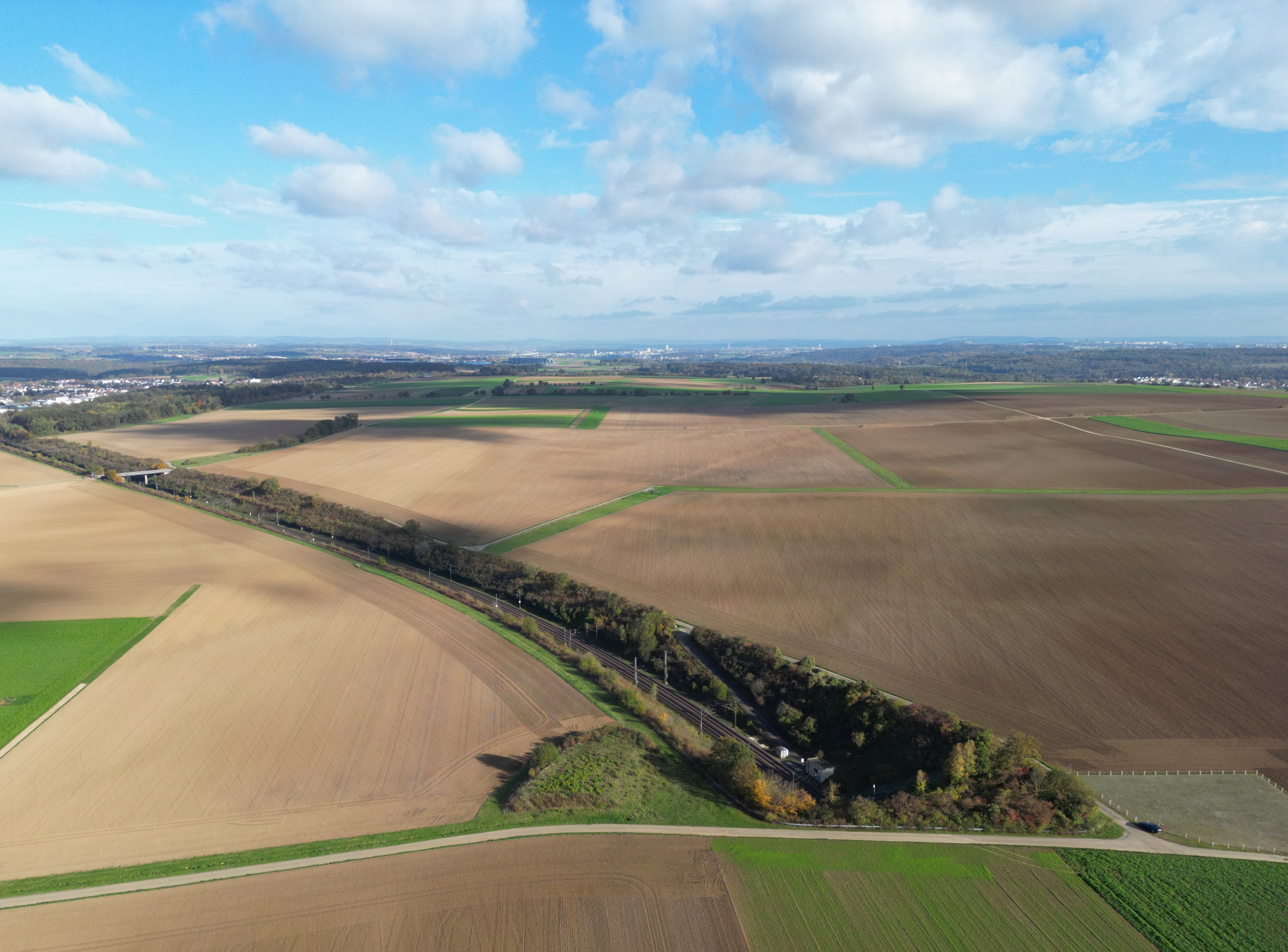 Platz für die Gewinnung von erneuerbaren Energien: Links und rechts der Bahnlinie könnte ein Solarpark entstehen – ganz in der Nähe des geplanten Windparks auf dem Weitfeld (rechts in Richtung Oberriexingen). Foto: Küppers
