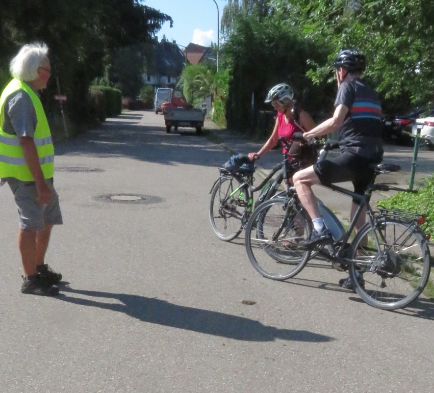 Und dabei sind sie auch auf einige Radfahrer gestoßen, die die Tour schon mal vorab gefahren sind – das war möglich, weil in der Zeitung bereits die Tourenkarte abgedruckt war. Auf dem folgenden Foto zum Beispiel ein Paar aus Vaihingen. Es ist Rolf Ziegler, Olympiateilnehmer von München 1972 über die 400 Meter Hürden (rechts im Bild). Mit dabei seine Partnerin Veronika Maiwald, eine sehr erfolgreiche Langstreckenläuferin, oftmalige Siegerin des Silvesterlaufs in Bietigheim. Wieso sie einen Tag vorher die 33 Kilometer abgefahren sind? Am Samstag ist es ihnen zu trubelig. Aber, und das freute die Schilderaufsteller, die beiden lobten die Strecke.