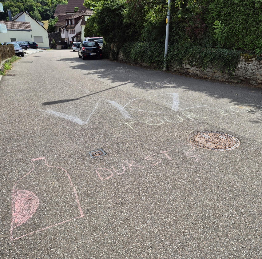 Die andere Getränkestation hatten die Helfer von Ensinger vor dem Vereinsheim in Serres aufgebaut. Zwar war es da gerade mal wieder bergab gegangen, ein paar Hundert Meter weit die Waldenserstraße entlang, doch bei der an sich sehr hügeligen Strecke und den warmen Temperaturen kam die Erfrischung etwa zur Halbzeit gerade recht. In Serres wie auch etwas später in Iptingen hatten Anwohner mit Straßenmalkreide aufmunternde Worte auf den Asphalt geschrieben. Bei dieser Tour wurde eines aber auch sehr offensichtlich – wer während der Bergauffahrt Luft fand, ein paar Worte mit den Zuschauern am Straßenrand zu wechseln, brauchte diese Luft nicht zum Trebbeln, sondern wurde hierbei von einem Elektromotor unterstützt.