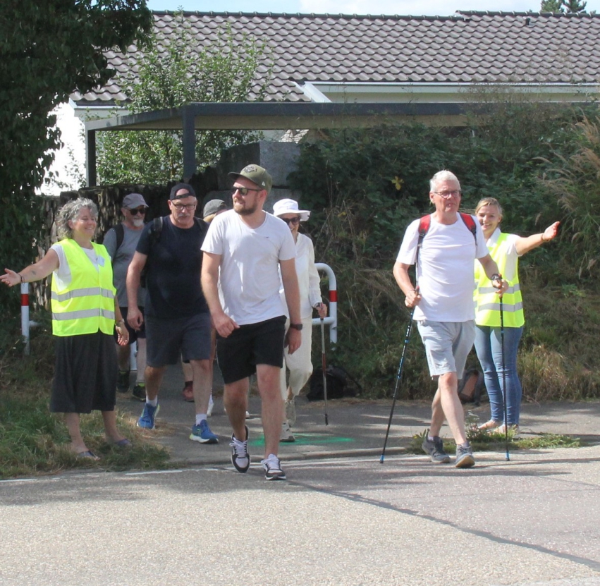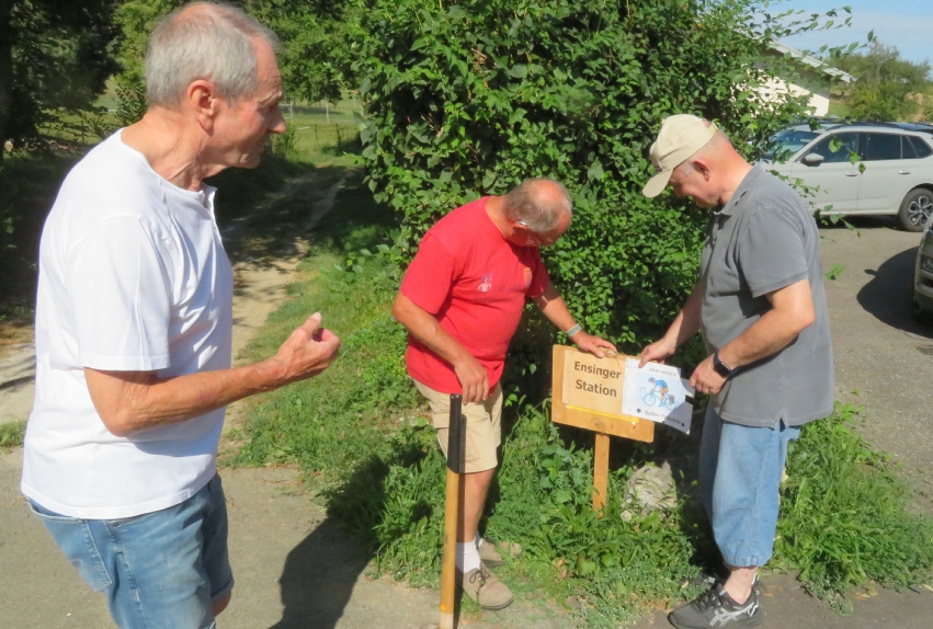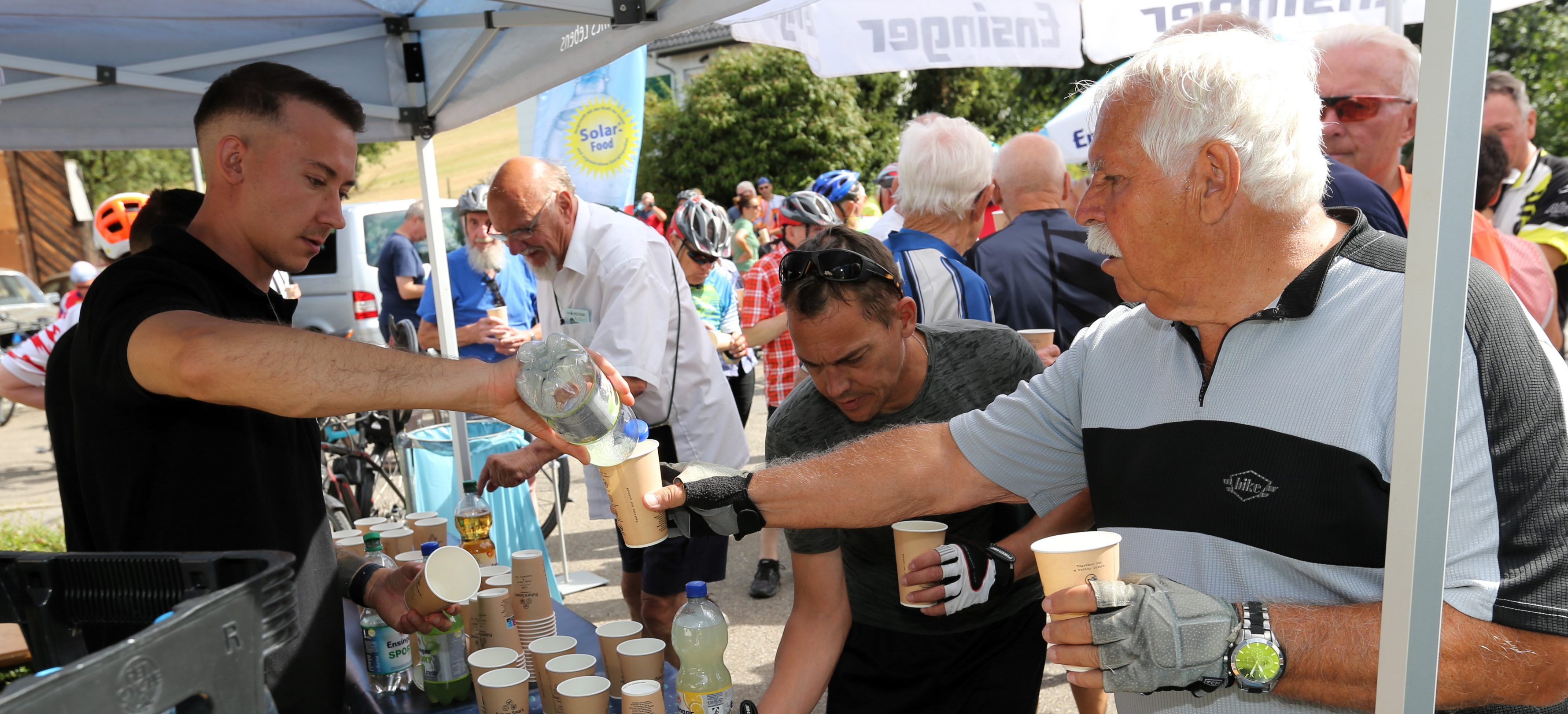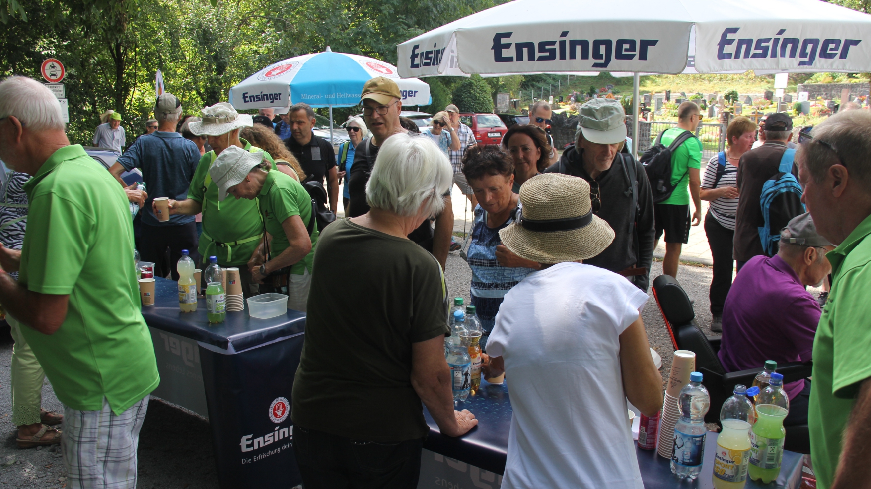 Lob gab es am Samstag auch von denjenigen, die zur Fuß unterwegs waren – unter anderem für die Mitarbeiterinnen der VKZ, die in Aurich dafür sorgten, dass die Wanderer und Wanderinnen gefahrlos die Kreisstraße passieren konnten. Die gute Stimmung bei der Teilnehmenden lag vermutlich auch daran, dass sie zuvor eine schattige Rast einlegt haben: Am Bürgerplatz war eine Ensinger-Getränkestation aufgestellt, an der Mitglieder des Schwäbischen Albvereins Enzweihingen Sprudel und Saftschorle für die Durstigen ausschenkten. Etwa 20 Kisten standen bereit. „Es läuft sehr gut“, sagte Willi Schüle, einer von sechs Albvereinlern, die sich um die Bewirtung kümmerten. Es herrsche auch angenehmes Wanderwetter; zwar sonnig-warm, aber mit einem erfrischenden Wind.