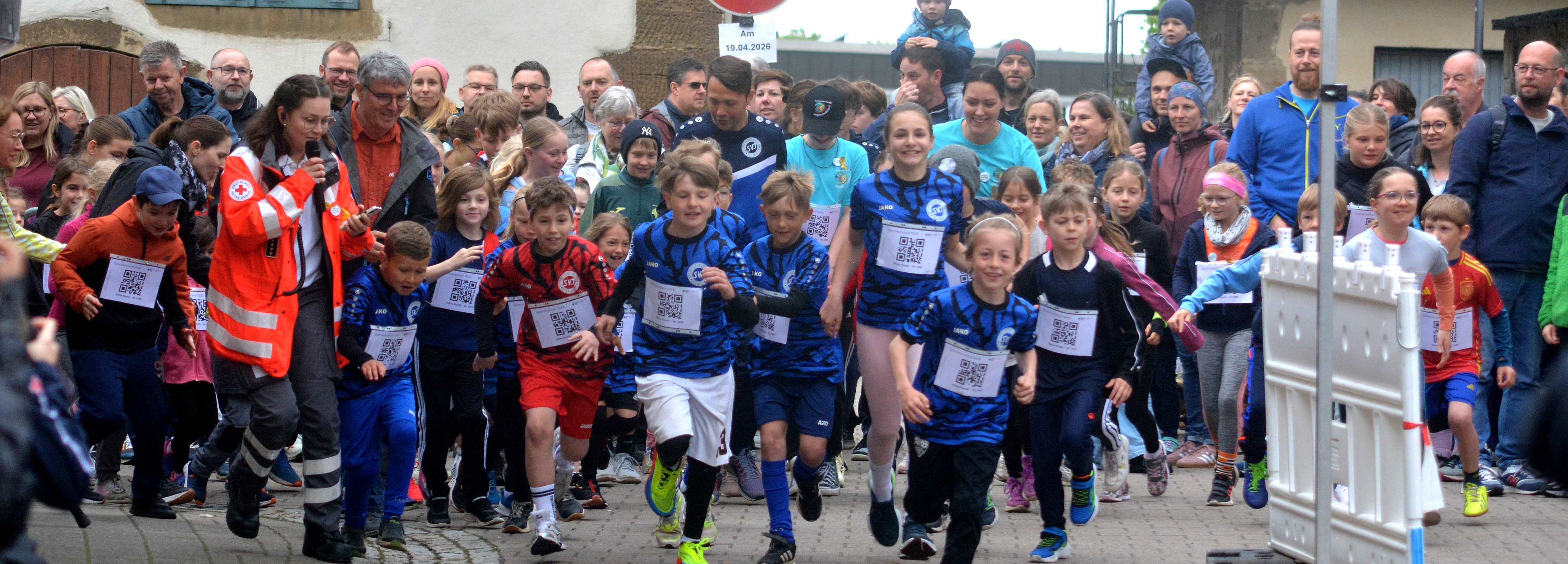 Start frei für einen Lauf, bei dem sich jeder Meter auszahlt: Die jungen Teilnehmer sind hochmotiviert. Das freut DRK-Organisatorin Chiara Zipperle (mit Mikrofon) und den Illinger Bürgermeister Armin Pioch (rechts daneben). Fotos: Stahlfeld
