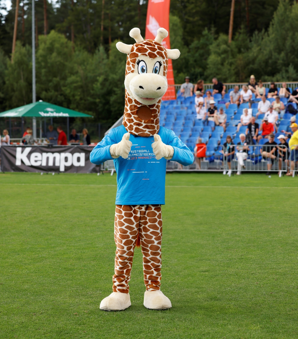 Gemeinsam mit den Fans eine grandiose Weltmeisterschaft erleben: Darauf freut sich Giraffe „Manni“, das Maskottchen der Faustball-WM 2023, das im Rahmen der Deutschen Meisterschaft in Unterhaugstett offiziell vorgestellt wurde.