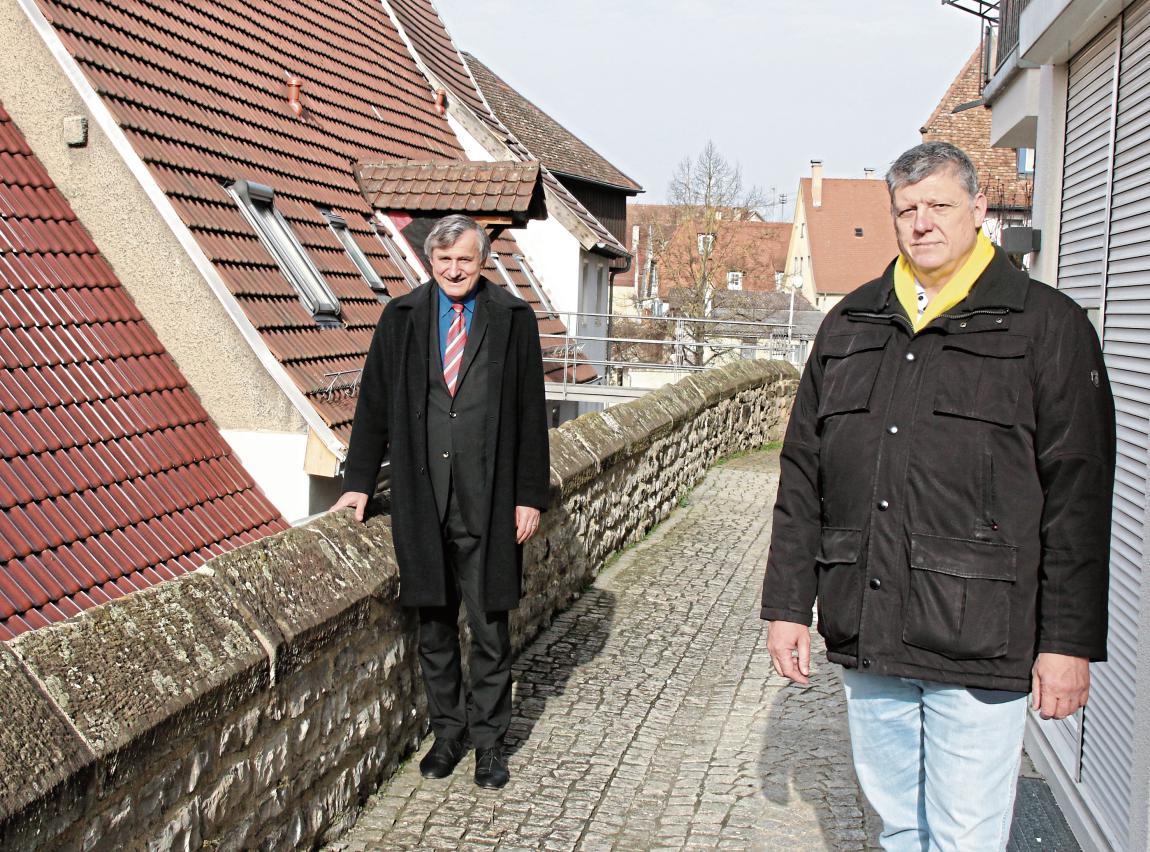 FDP-Wahlkreiskandidat Roland Zitzmann (rechts) aus Horrheim ist auf der Vaihinger Stadtmauer mit dem Spitzenkandidaten im Land, Hans-Ulrich Rülke, unterwegs.