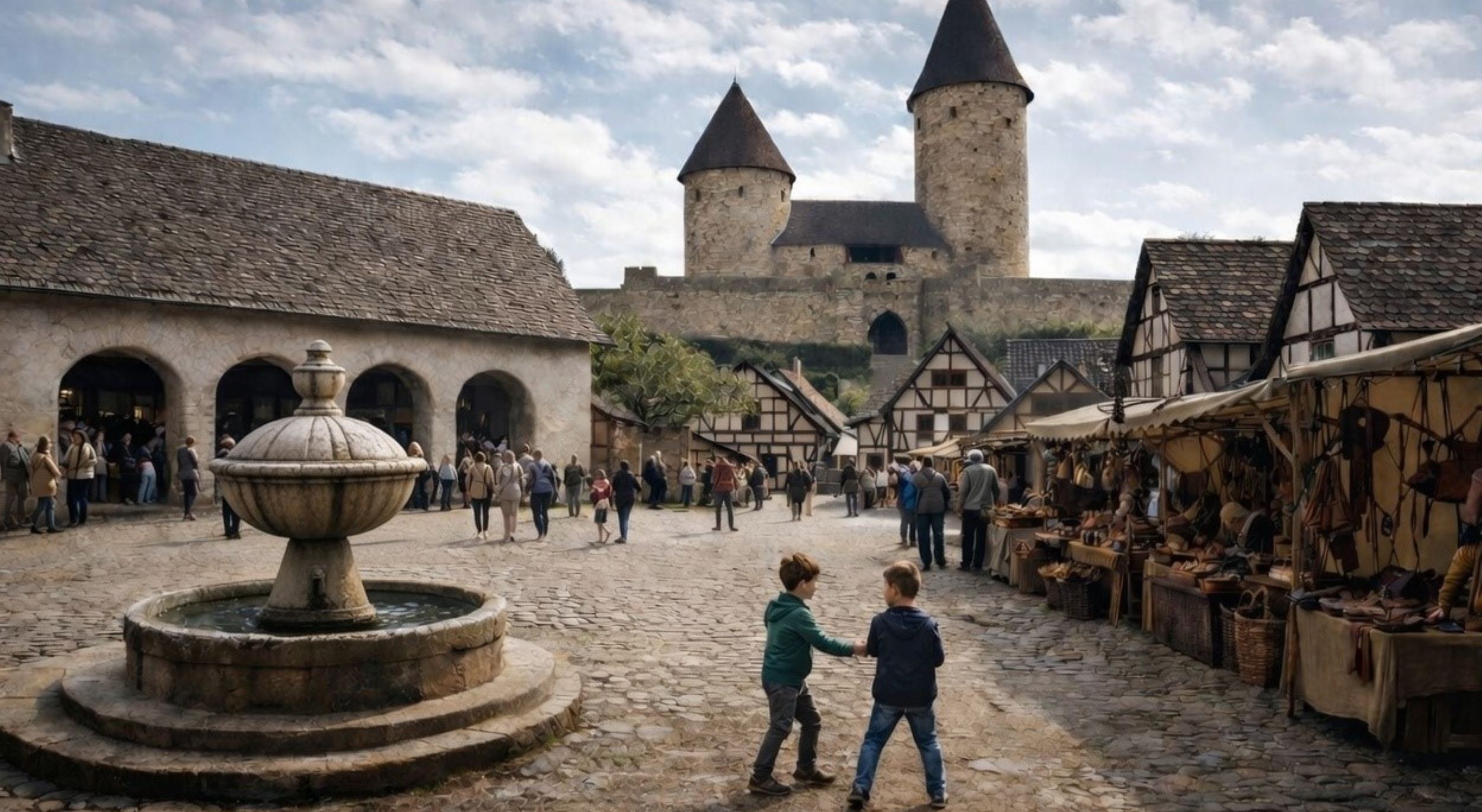 Wie könnte die mittelalterliche „Erlebniswelt Markstein“ aussehen? Die Initiatoren lassen eine KI eine Inspiration für Marktplatz mit Markthalle und Blick auf die Burg entwerfen. Visualisierung: Epic Realms Ventures