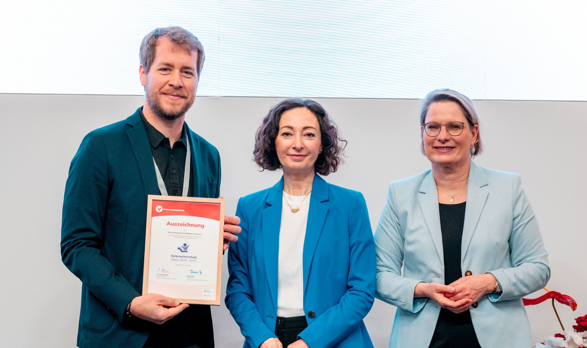 Schulleiter Jürgen Joss mit Ramona Pop vom Bundesverband Verbraucherzentrale (Mitte) und Dr. Stefanie Hubig, Bundesministerin für Verbraucherschutz. Foto: Studioberlin361