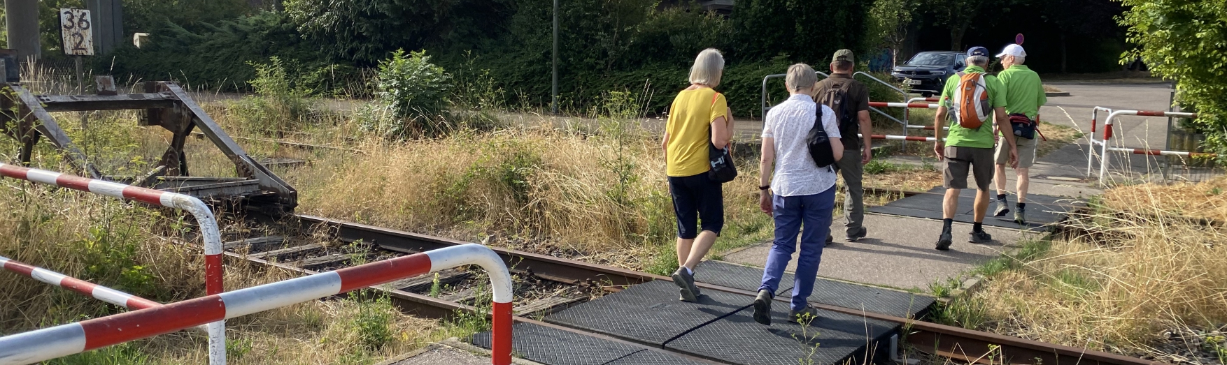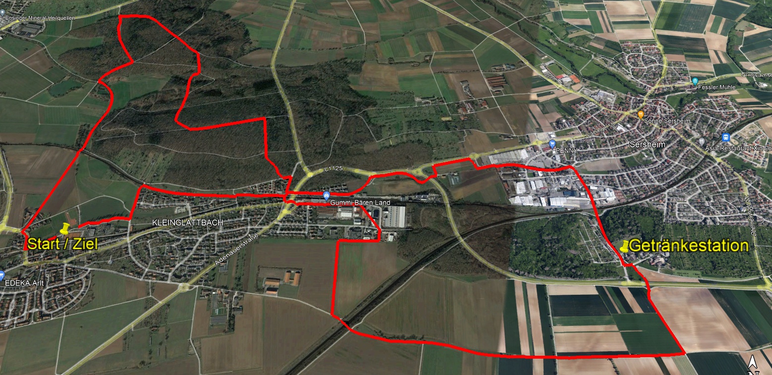 Los geht es für alle Teilnehmer bei der Halle im See in Kleinglattbach, von dort aus führt der Weg weiter in Richtung der alten Gleise. An diesen laufen die Wanderer entlang bis zur Unterführung in der Bahnhofstraße. Dort werden die Gleise zunächst am Fußgängerüberweg überquert und dann geht es ein Stück auf der Industriestraße weiter, bevor dann ungefähr auf Höhe des Gummi-Bären-Lands nach rechts abgebogen wird und dann der Uhlandstraße bis zum Ende gefolgt wird.
