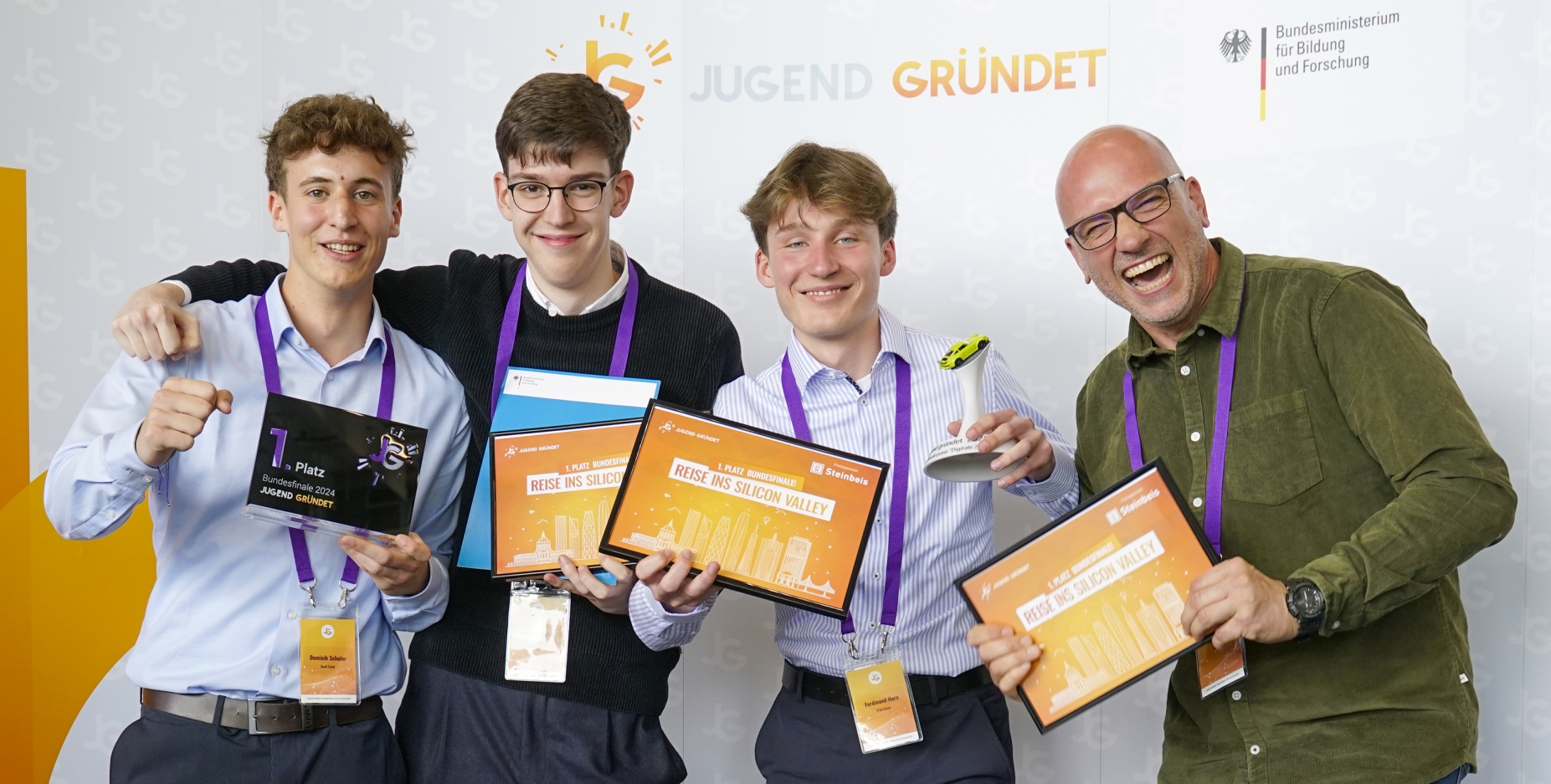 Mit „blind Sonar“ zum Bundessieg (von links): Dominik Schuler, Julian Schenker und Ferdinand Horn. Lehrer Timo Schuh betreut das Team. Foto: Jugend gründet