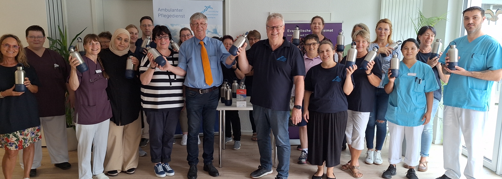 Kühles Wasser auch im Sommer immer griffbereit: Der Förderverein der Sozialstation beschafft isolierte Flaschen für die Pflegekräfte. Foto: Glemser