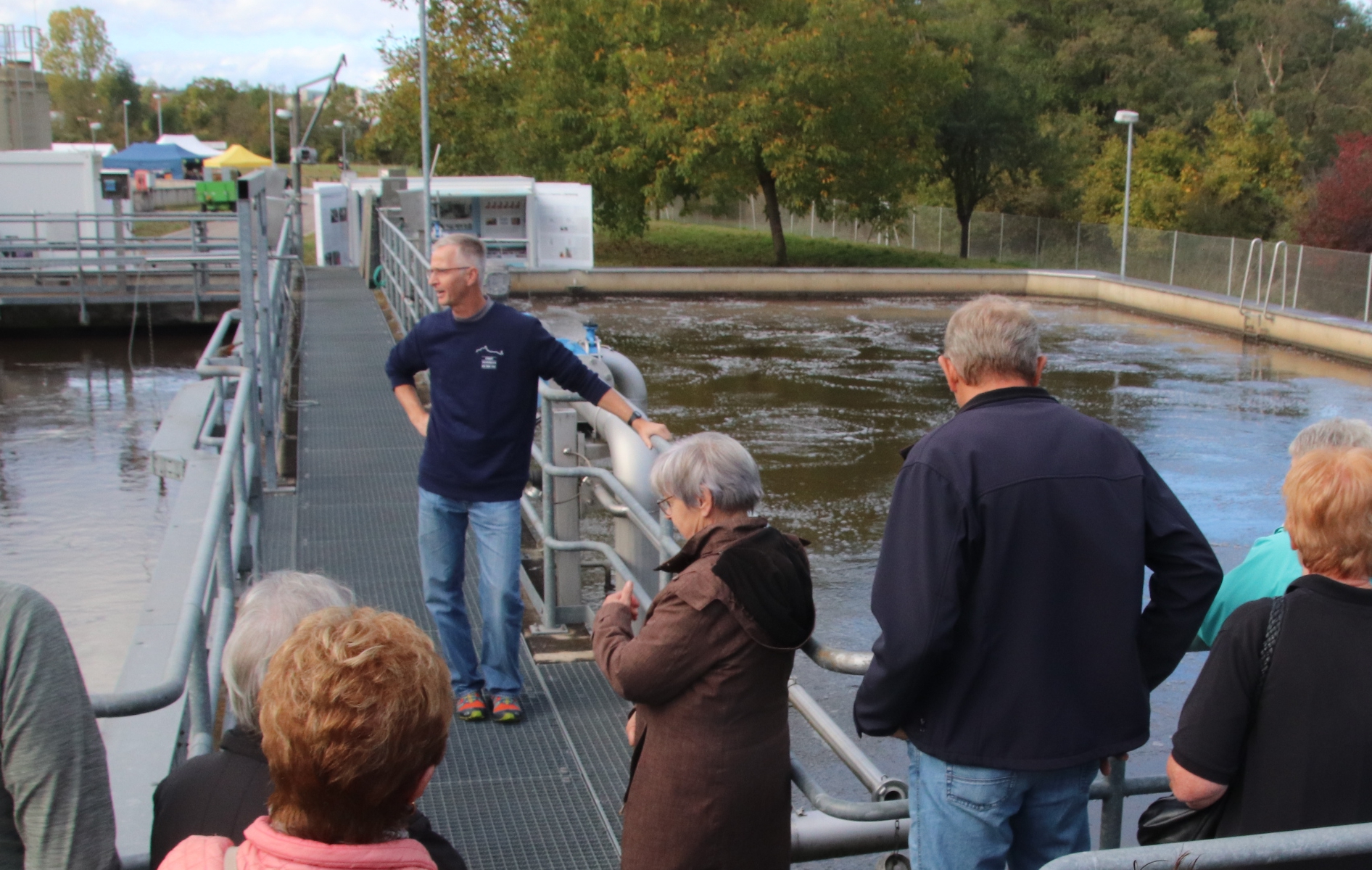 Abwassermeister Jörg Esenwein erklärt bei einer Führung im Herbst 2023 an den Belebungsbecken die Funktion der Biologischen Reinigungsstufe im Klärwerk Strudelbach. Unter anderem dieser Bereich der Anlage soll nun erweitert werden. Archivfoto: Arning