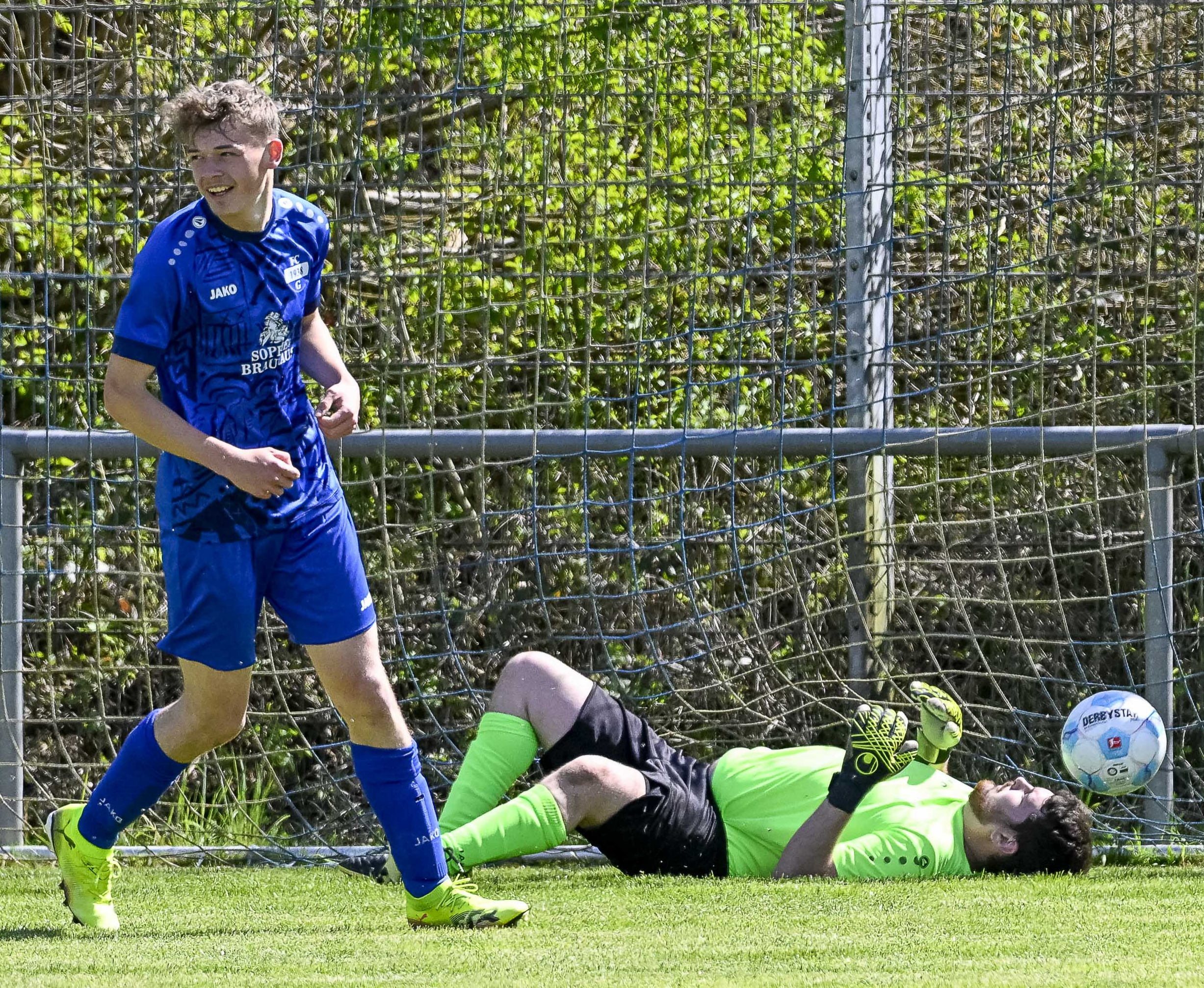 Max Krüger (links) freut sich über die Führung der SGM Gündelbach/Häfnerhaslach. Der Keeper aus Sternenfels ist machtlos.