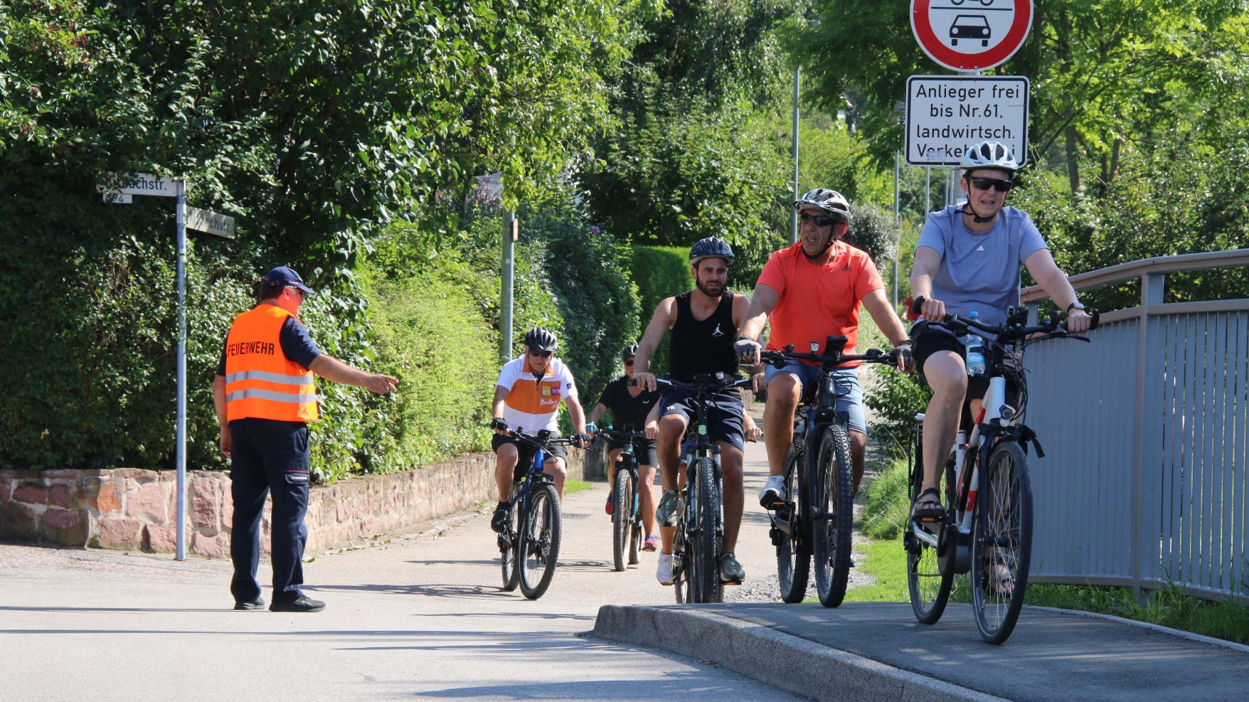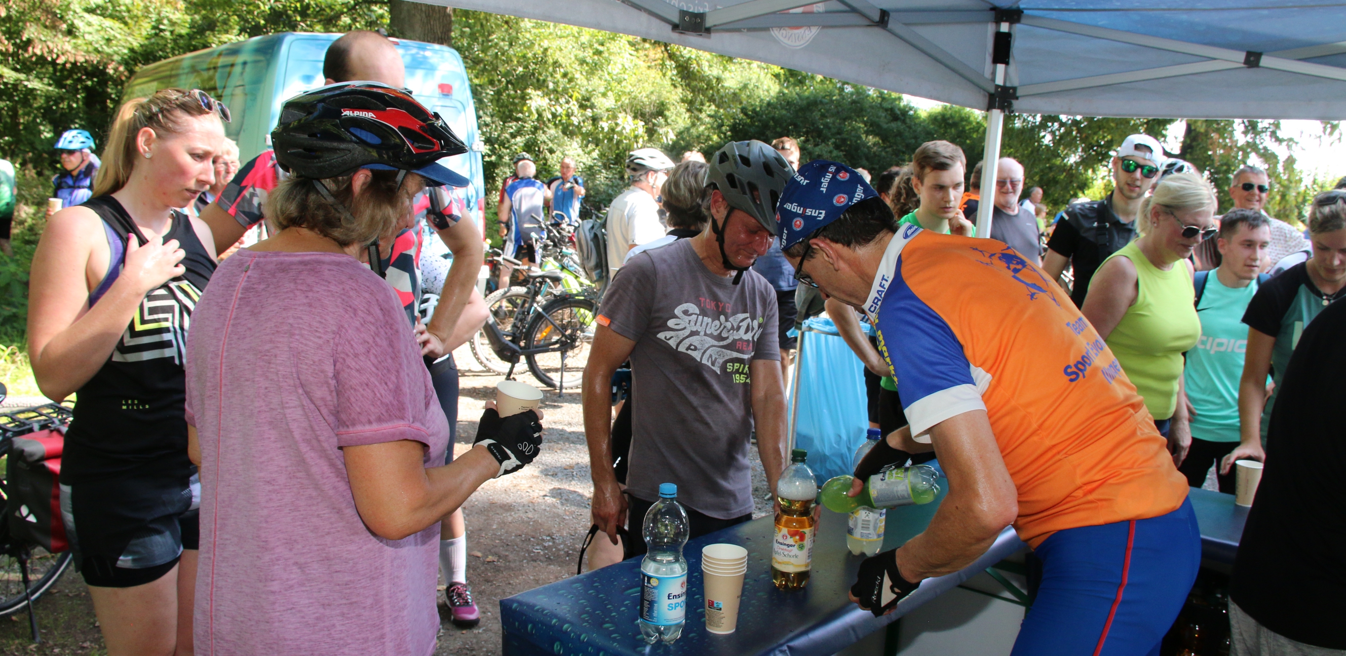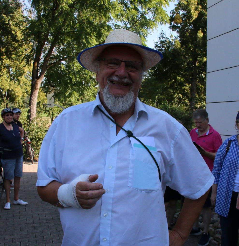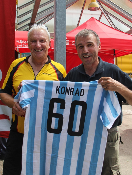 Die Familie Fechner kommt mit dem Fendt Geräteträger aus Gündelbach zur S-VKZ-Tour am Samstag nach Kleinglattbach. Nach der Traktorfahrt geht es auf die Wanderstrecke. „Und dann tuckern wir wieder gemütlich heim. Aber im Schatten“, sagt Günter Fechner. meldet die Feuerwehr Bedenken an. Beim Ausschildern am Freitag gibt es beim Römerhof in Oberriexingen zwei Streckenvorschläge. Die offizielle Route führt ins Enztal runter oder eben die Abkürzung, wenn man einfach auf dem sogenannten Promillesträßle weiter gen Vaihingen rollt. Aber da stehen dann keine Posten der Feuerwehr – beispielsweise bei der Einmündung der Eichendorffstraße. Also zu gefährlich, das Schild für die kürzeren Route wird dann kurzerhand von der Feuerwehr abmontiert. bei der Tour dabei ist, ist der Vaihinger Stadtrat Peter Schimke. Sonst ist er immer mit dem Fahrrad unterwegs, am Samstag macht er sich aber das erste Mal auf die Wanderstrecke. Wegen einer Verletzung an der Hand. Bei dem Aussteigen aus einer Kabine im Erlebnispark Tripsdrill ist Schimke hängengeblieben. Die Wunde an der Hand musste genäht werden. Peter Schimke marschiert mit einem Verband bei der Hitze mit. von Ensinger Mineral-Heilquellen sorgen am Samstag bei Temperaturen über 30 Grad für die kostenlose Erfrischung für die Radler und Wanderer. Für die Station beim Sachsenheimer Schützenhaus hat Kütterer mehr als 80 Kisten Wasser, Apfelsaftschorle und Iso-Getränke im Transporter geladen. ist mit elf Helfern bei der Tour dabei. Im Einsatz ist auch wieder die Motorradstaffel. Nach Angaben von Einsatzleiter Konstantin Frank gibt es zwei Schürfwunden nach Stürzen zu behandeln – einmal in Sachsenheim, einmal kurz vor dem Ziel. Walter Hertler aus Aurich kommt bei der Tour nicht besonders weit. Bei Sersheim gibt es einen Platten. Aber mithilfe von Martin Fischer von Zweirad-Fischer, der wieder für den mobilen Pannendienst sorgt, ist der Schaden schnell behoben. Hertler kann weiterradeln. bei der S-VKZ-Tour ist der Landtagsabgeordnete Konrad Epple. Er hat ganz normal eine Startkarte für einen Euro gekauft. „Sonst heißt es Vorteilsnahme im Amt“, sagt der Pedelec-Fahrer lachend. Nach seiner eigenen Erinnerung war Epple bis jetzt nur einmal nicht bei der Tour am Start. Das war, als zeitgleich der Schäferlauf in Markgröningen war. „Und das ist ein Nationalfeiertag“, sagt Epple. Gefeiert hat er vor einigen Tagen – seinen 60. Geburtstag. Deswegen gab es am Samstag ein Geschenk für ihn: Jürgen Pfeiffer von den Sersheimer Löwen hat ihm ein Trikot geschenkt. Natürlich das blau-weiße vom TSV 1860 München; über der Zahl 60 auf dem Rücken prangt der Name Konrad.