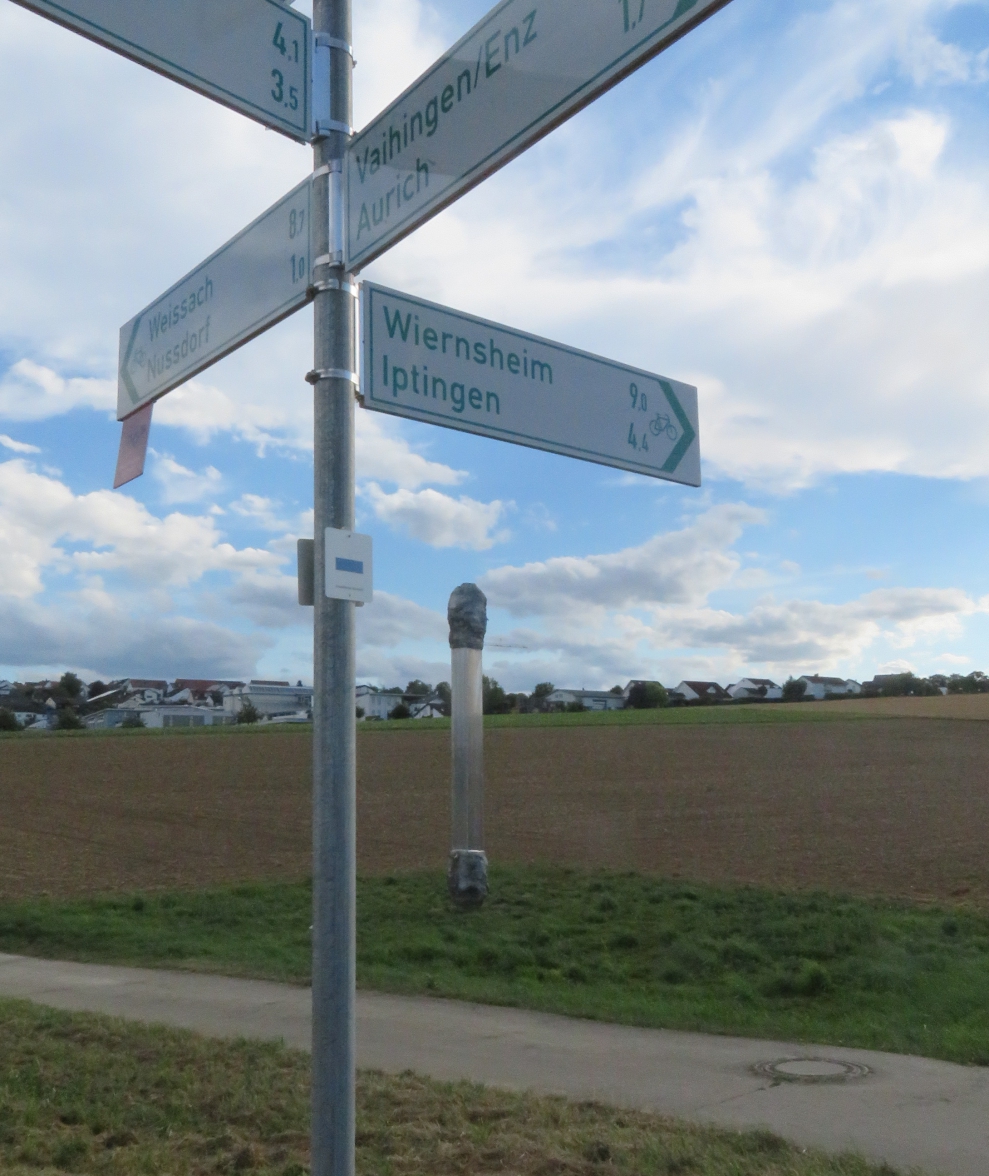 Gleich nach dem Ortsschild links ab, Radweg Enzweihingen, Aurich. Von Weitem grüßt der Kaltenstein. Kilometer 26,1: Straße nach Aurich mit der großen Skulptur aus Aluminium. Titel: „Landmarken, weiter als das Auge reicht“. Die Kanaldeckel auf der Fahrt Richtung Hof Lohrmann/Berghof sind etwas entschärft worden. Blick aufs Enztalviadukt der Schnellbahn, Kaltenstein. Jetzt die Bremshebel im Griff haben. 13 Prozent ist das Gefälle der Bonlander Steige. Kilometer 29,5: Rieter Straße. Beim Holzland Metzger (früher Schweizerhof) links in die Beerhaldenstraße und bei Kilometer 30,2 in die Klaiberstraße. Hinunter zum Hammelbergweg. Bitte die Serpentine nicht unterschätzen. Und jetzt: Finale!
