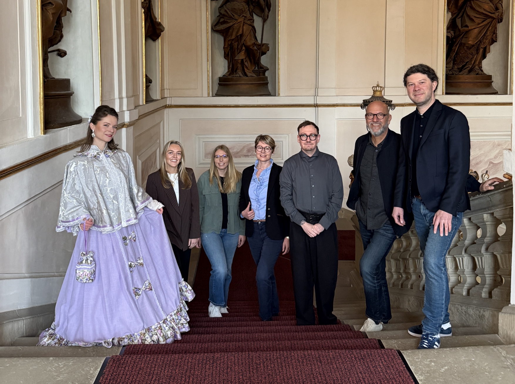 Freuen sich auf die Saison 2026 im Residenzschloss (von links): Kostümführerin Nathalie Duda, Jasmin Fritz (Schlossverwaltung), Lilly Scholz (Eventstifter), Patricia Alberth (Staatliche Schlösser und Gärten), René Burtscher und Frank Sautter (beide Karlshöhe Ludwigsburg) sowie Lucas Reuter (Intendant der Ludwigsburger Schlossfestspiele). Foto: SSG/Finia Saß