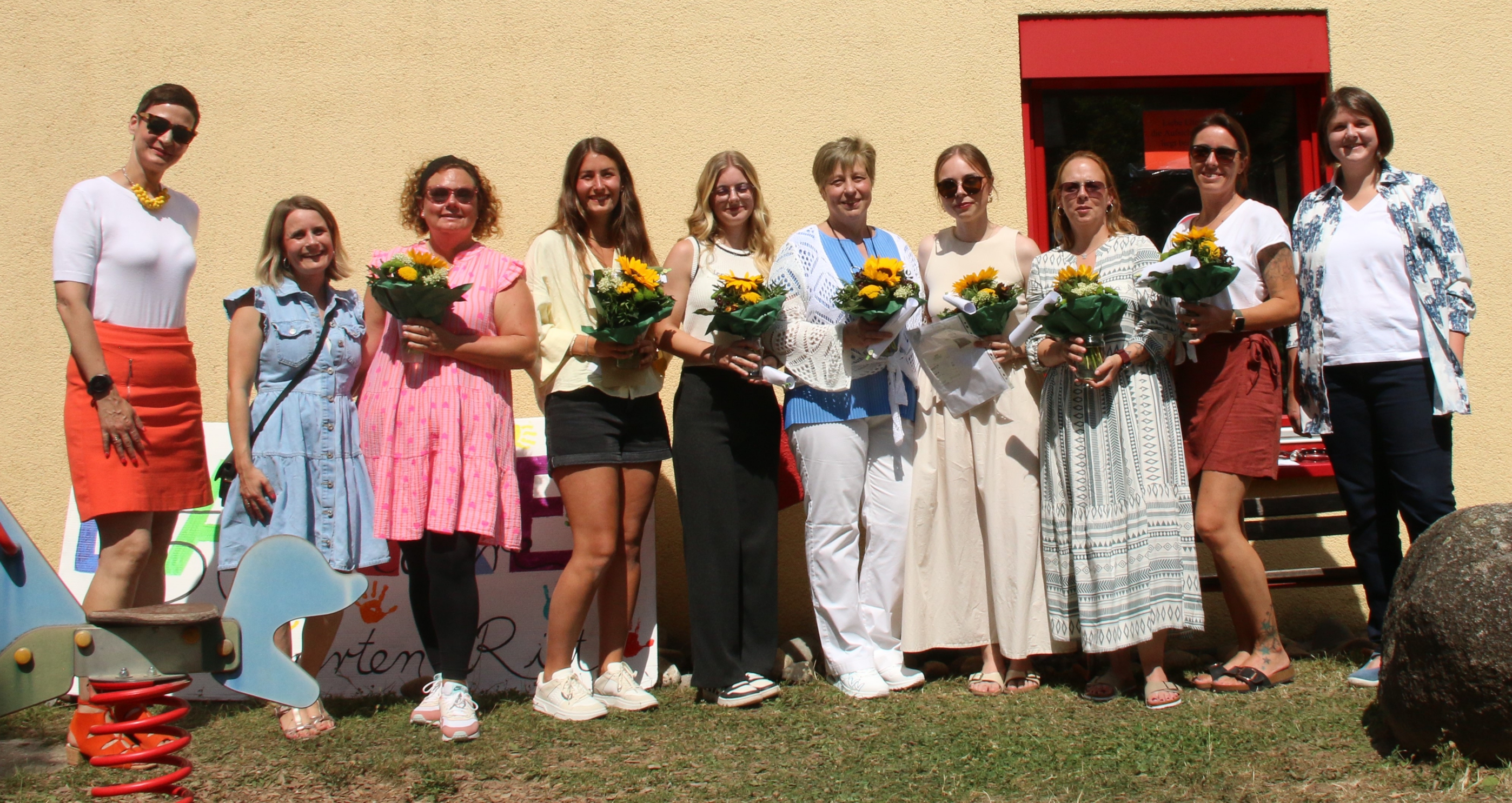 Ortsvorsteherin Kimberly Gräfin von Reischach (links) und Amtsleiterin Barbara Ogbone (rechts) gratulieren den Erzieherinnen. Foto: Mross