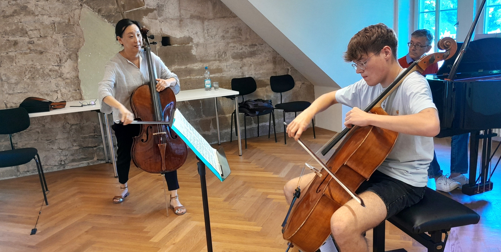 Kilian Ecker (19) folgt genau dem Fingersatz, den ihm die Cellistin und Musikpädagogin Hyun-Jung Berger empfiehlt. Am Flügel Pianist und Liedbegleiter Andreas Kersten.