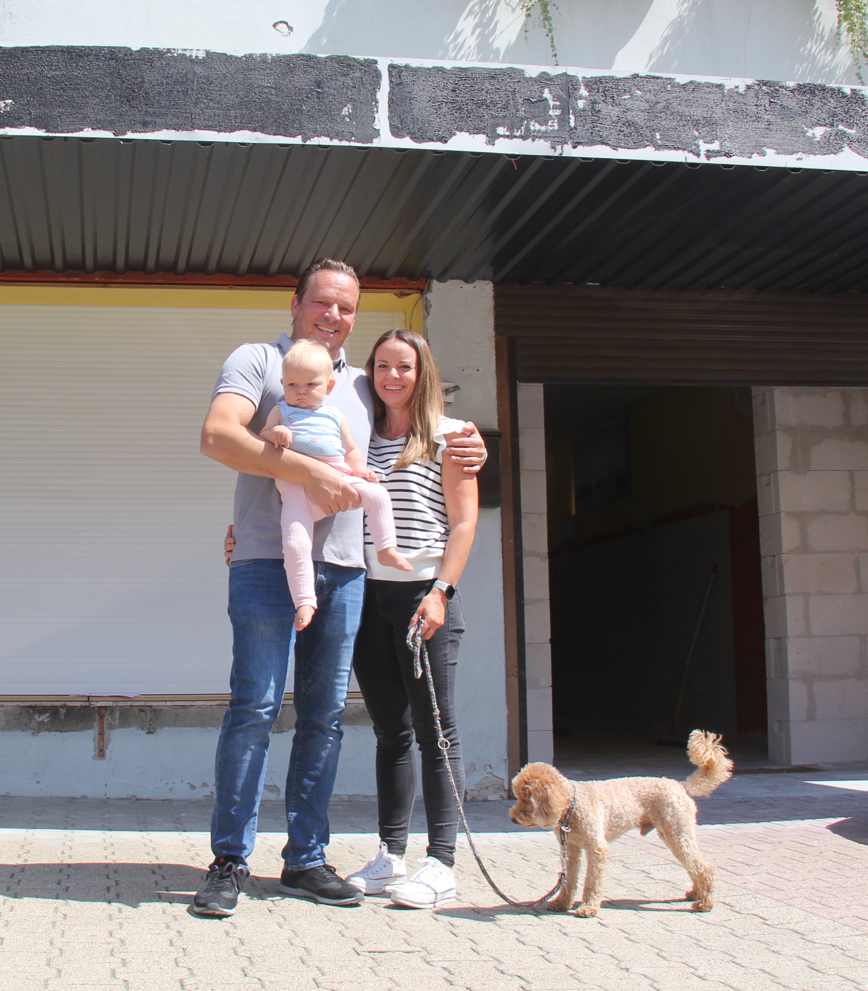 Sind in Oberriexingen verwurzelt und möchten dem Ort etwas Gutes tun: Markus und Sabrina Buck, mit Tochter Mila und Hund Biti vor dem künftigen Tante M-Laden. Foto: Kauer