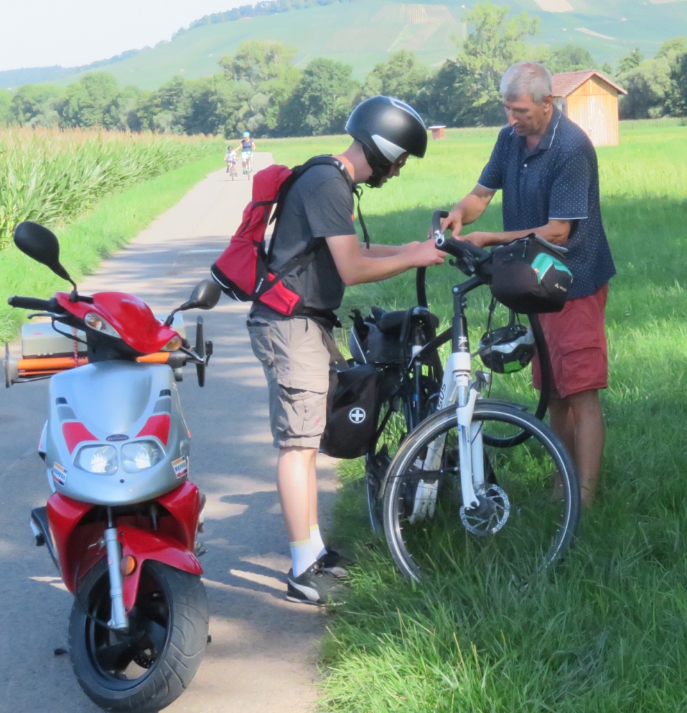 Erster Panneneinsatz für Martin Fischer auf dem Kanalweg kurz vor Sersheim. Walter Hertler hat das Hinterrad des Pedelecs seiner Frau schon ausgebaut. Fischer kann weiterhelfen. Der Anstieg von der Metter hoch Richtung Kreisstraße Sersheim – Hohenhaslach ist etwas heimtückisch. Da braucht der kleine Sohn mit der Rückennummer 1 schon etwas Anschubhilfe von der Mama. Lockere Gespräche sind jetzt problemlos möglich. Die Frau aus Ensingen ist zum ersten Mal dabei. Kühltasche mit Wasserflasche und Kühlakkus auf dem Gepäckträger. Sicher ist sicher. Da erfährt man von Ulrich Siehler aus Enzweihingen, der seine beiden Kinder mit dem Pedelec des Vaters im Anhänger hinter sich herzieht, dass die Spielanlage im Pulverdinger Holz Ende September offiziell eingeweiht wird.