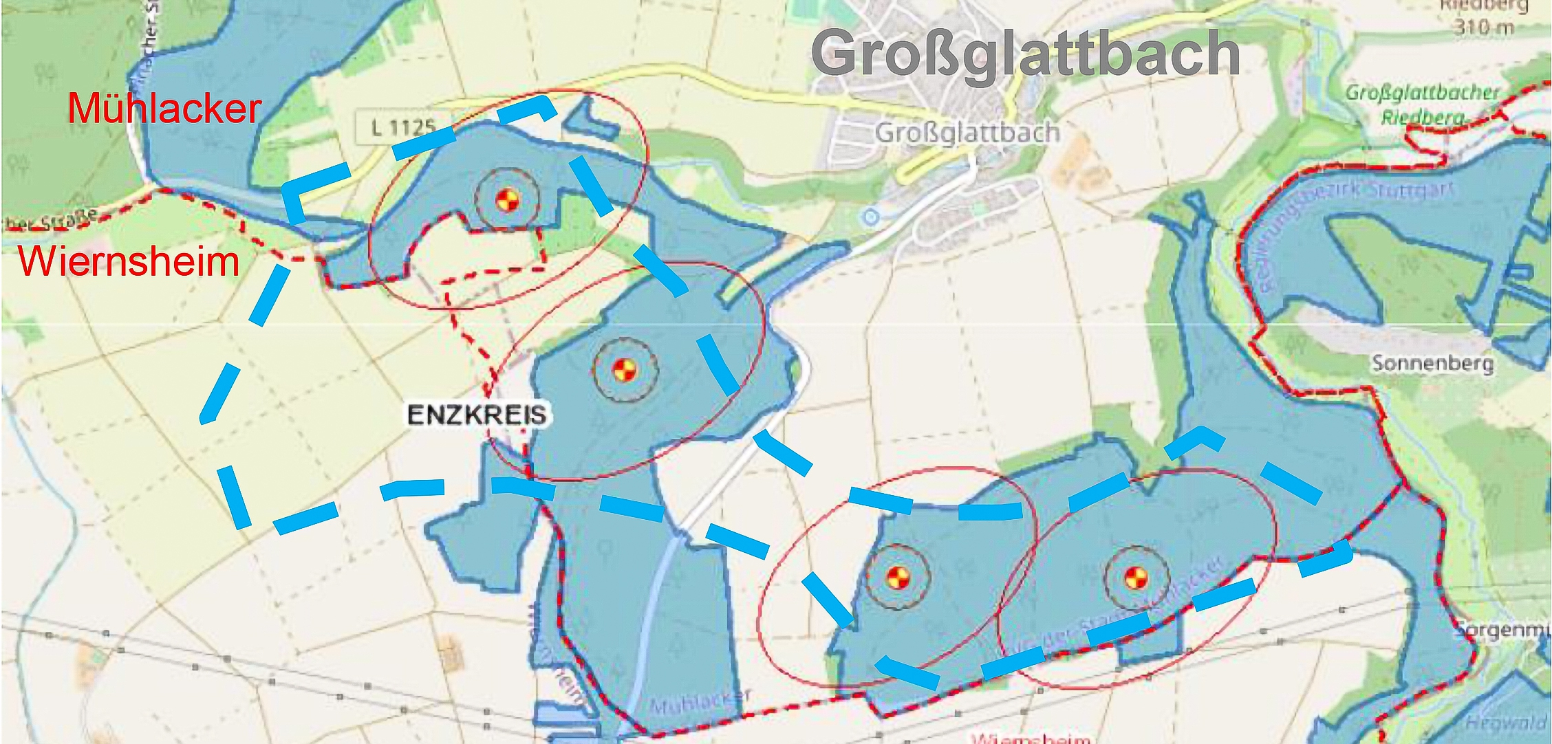 Auf einer Karte des Stadtwerke-Verbunds Kommunal-Partner, der gemeinsam mit den Stadtwerken Mühlacker das Projekt vorantreiben soll, sind die potenziellen Standorte für die vier Windanlagen im Gemeindewald bei Großglattbach vermerkt. Foto: p