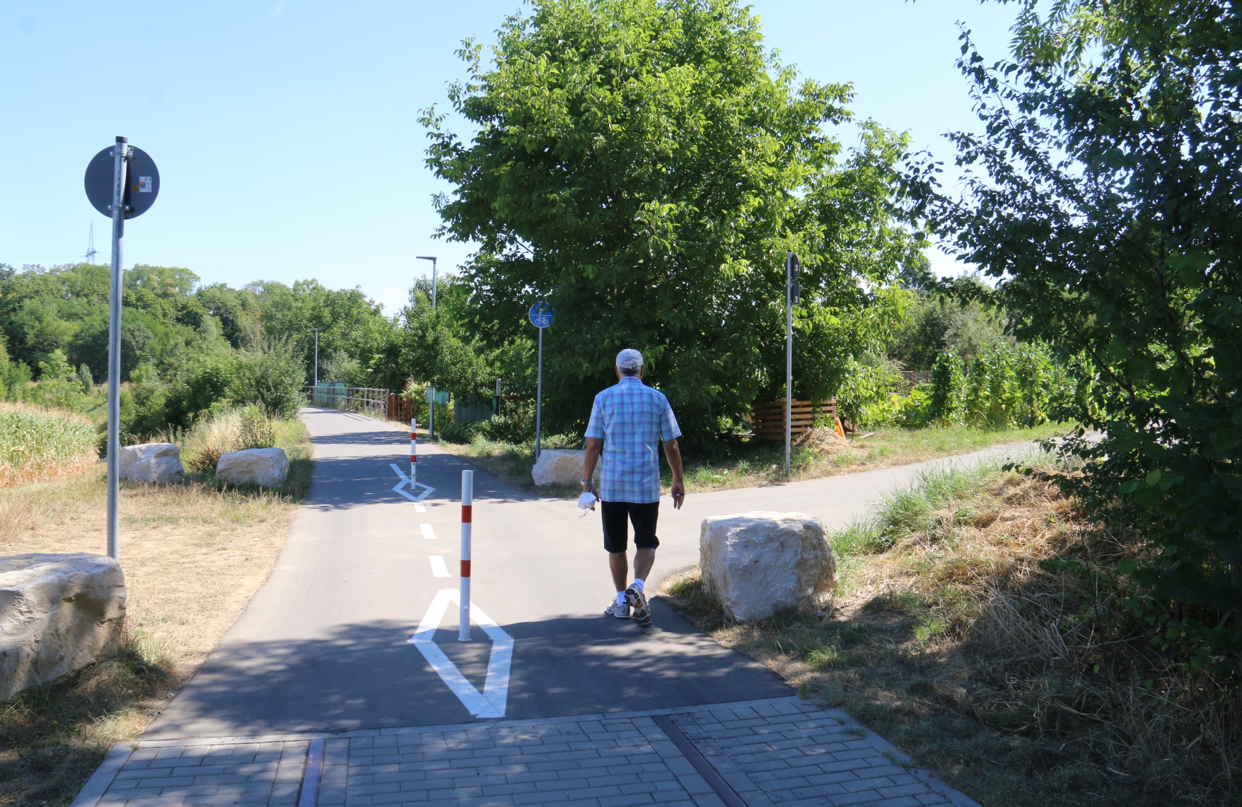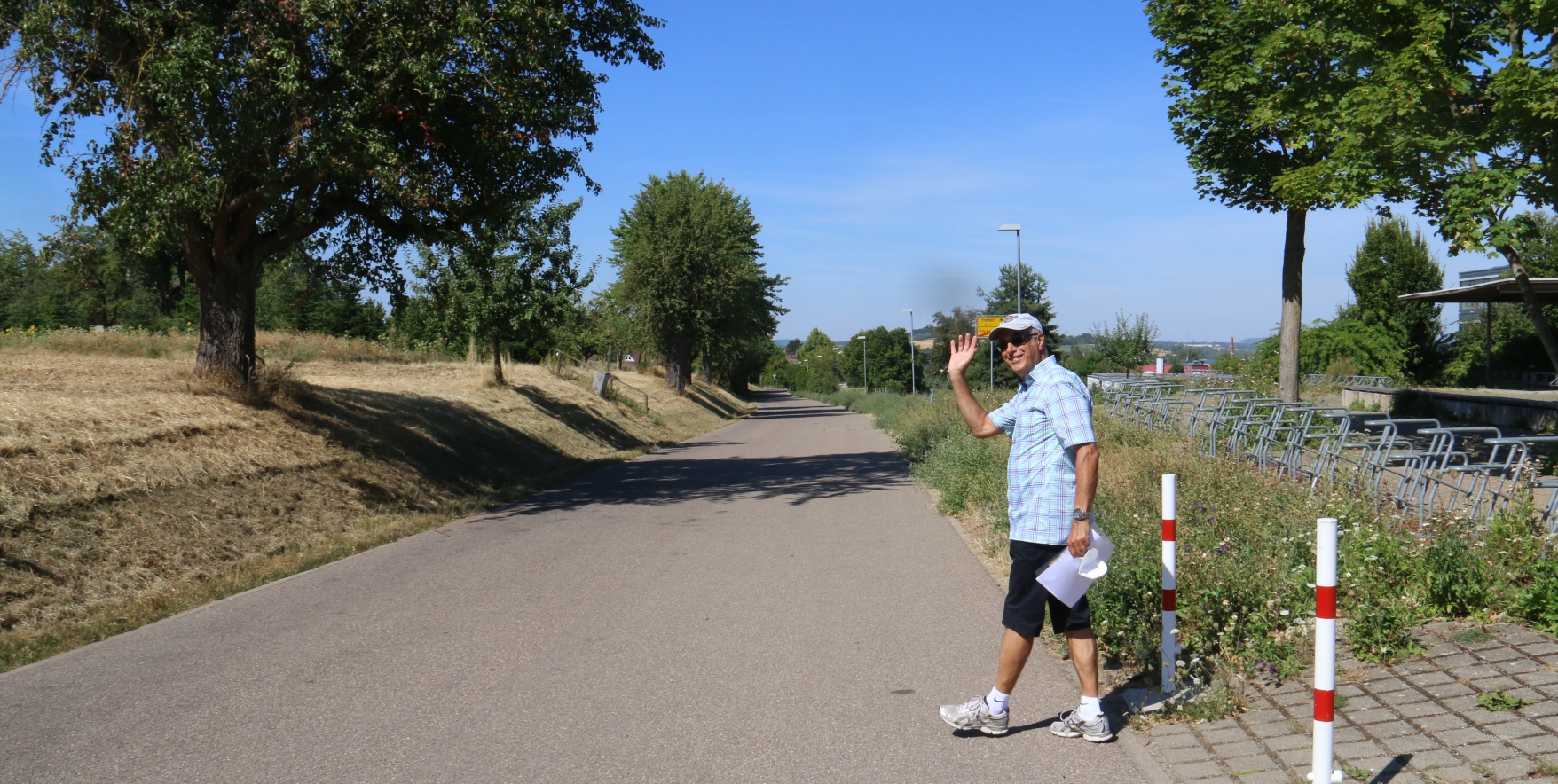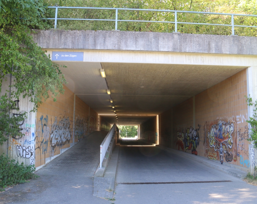 Nach dem gemütlichen Anfang der Wanderung geht es nun kontinuierlich bergauf, bis zum Ende des Bahnradweges vor Kleinglattbach. Nach dem Tunnel unter den Bahntrassen geht es rechts ab und auf dem Radweg bis zum Nordausgang des Vaihinger Bahnhofs. Vor dem Nordausgang halten sich die Wanderer rechts und gehen auf dem Fahrweg weiter bis zur Bahnunterführung unterhalb der Straße zum Perfekten Standort. Dort, auf der Nordseite der Bahnunterführung, wartet die Getränkestation der Firma Ensinger. Im Schutz des Bauwerkes können sich die Wanderer dann für den etwas längeren zweiten Teil der Wanderung ausgiebig erfrischen. Die Tour führt danach entlang der DB-Fernverkehrsstrecke in Richtung Ensingen. Nachdem die Illinger Straße (K 1699) auf Höhe der Obstplantagen überquert wurde, führt der Weg in den Wald und zum Gewann Schelmenbusch hinunter.