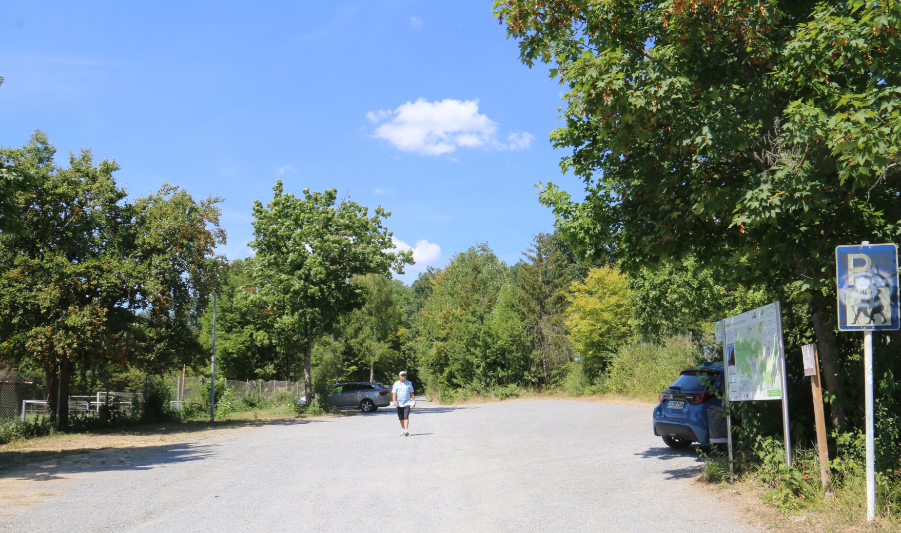 Eine Zeitlang geht es nun neben der Bahntrasse her, dann wird der kleine Erbbach gequert und die Wanderer steigen auf breiten Waldwegen in Richtung Zachertsklinge. Der Eingang zu Klingen wird links liegengelassen und dem höchsten Punkt der Wanderung, einer Neuanpflanzung der Forsten BW auf circa 305 Metern, entgegengewandert. Nach der Schonung geht es rechts ab und in Richtung Ensingen den Berg runter. Wenn der Glattbach überquert ist, ist es nur noch eine kurze Strecke bis zum Schützinger Weg, der dann immer durch den schattigen Wald bis hin zum Ziel am Sportplatz Ensingen führt. Dort bewirten die Helferinnen und Helfer des TSV Ensingen. Begleitet wird er Wandertross auch von zwei DRK-Leuten.