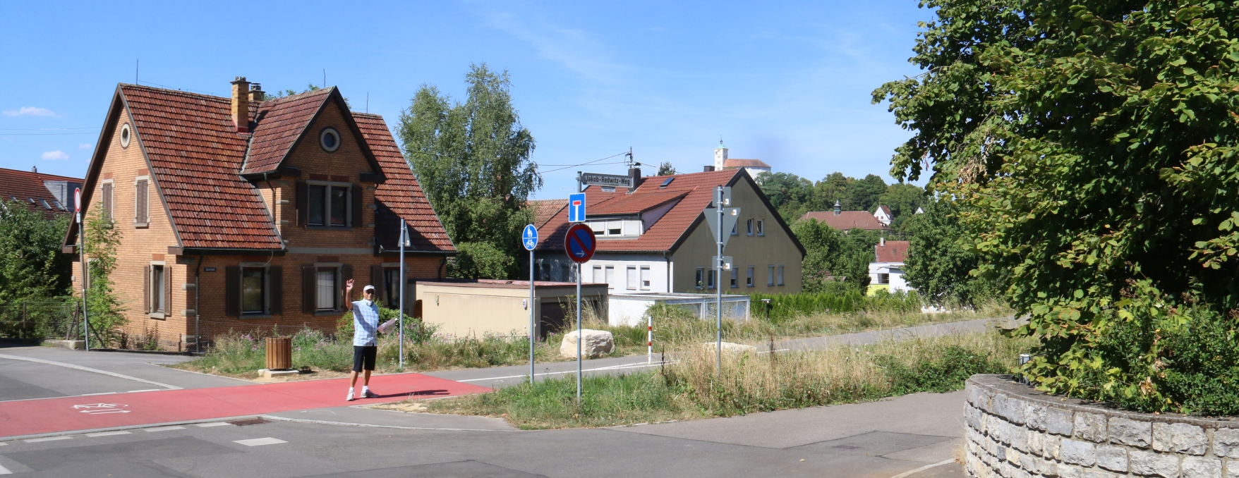 Vom Stromberg-Gymnasium geht es den Nebenweg hinunter bis zur Einmündung Gerokstraße, in die links abgebogen wird. Kurz danach geht es an der Kreuzung weiter rechts hinab in die Eichendorffstraße, die wenig später auch nach links abbiegt – dieser Abbiegung wird aber nicht gefolgt. Vielmehr halten sich die Wanderer quasi geradeaus bergab, kommen so in die Lessing- und die Goethestraße hinunter bis zur Bismarckstraße und schließlich zum Bahnradweg beim ehemaligen Stadtbahnhof bei der Hans-Krieg-Straße. Es wird nach rechts in Bahnradweg abgebogen, in Richtung Nordwesten und Bareselgelände.