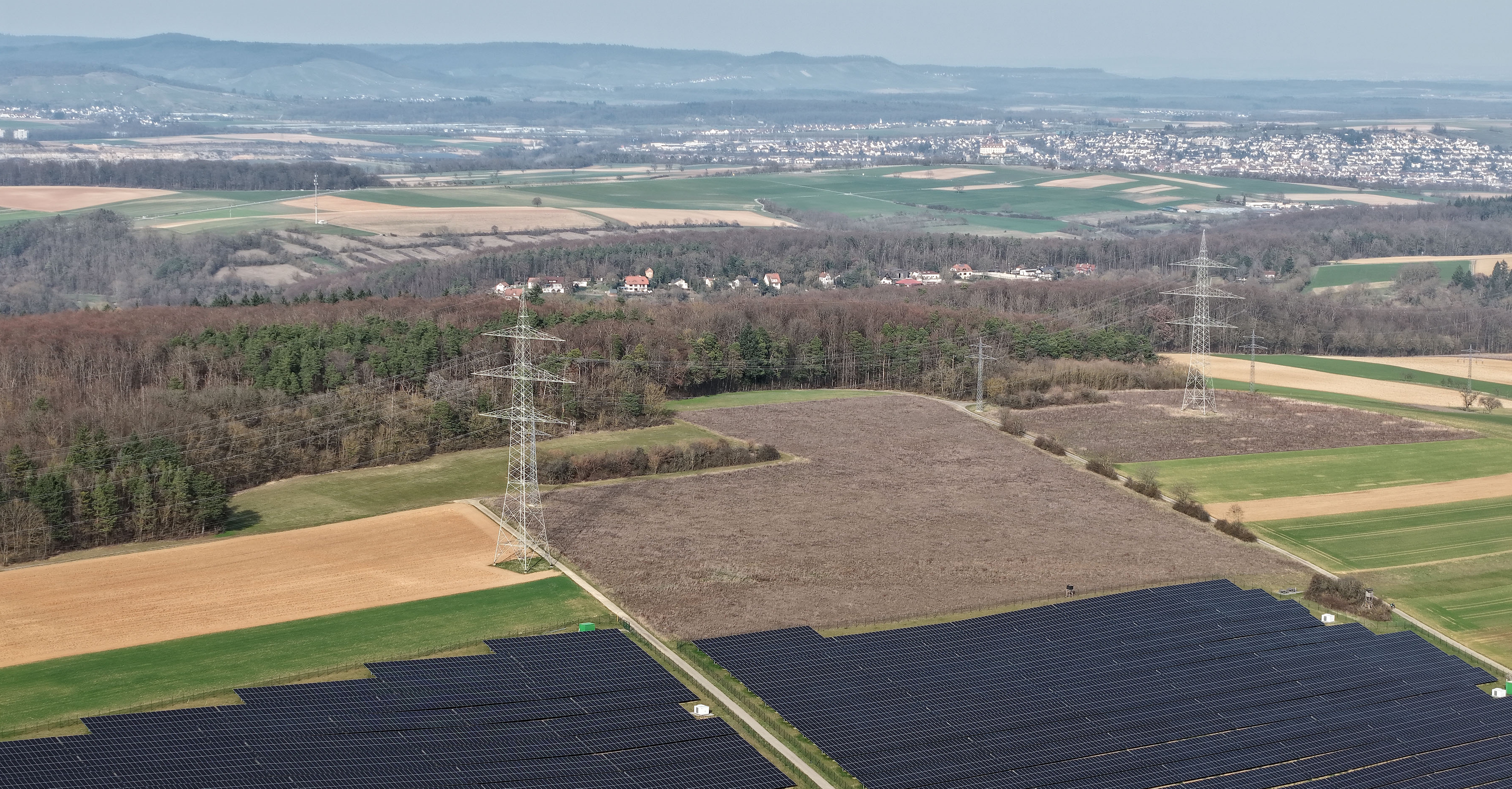 Zwischen der Freiflächen-Photovoltaik im Iptinger Ortental (vorne) und der Stadt Vaihingen (hinten) liegen der Höhenzug, der als Windrad-Standort auserkoren ist, und die Eberdinger Siedlung Sonnenberg.