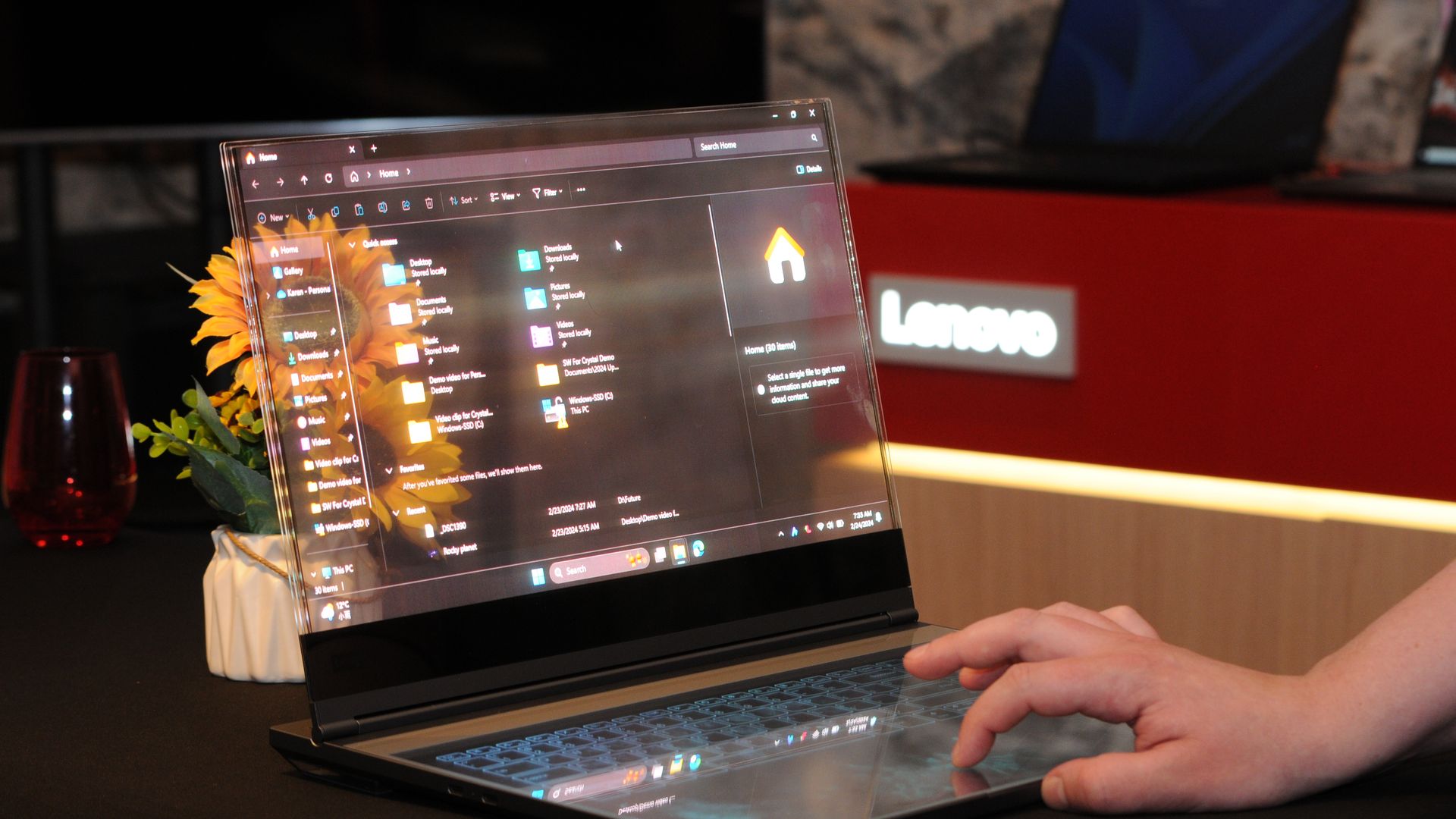 2024 hatte Lenovo einen Laptop mit durchsichtigem Bildschirm vorgestellt. Der sollte Kreativen helfen, die mit einem Stift etwa ein Objekt hinter dem Bildschirm sehen und dies abzeichnen können. Außerdem sollte der transparente Screen ermöglichen, dass sich ein Verkäufer und der vor ihm sitzende Kunde ohne Sichtblockade sehen können.
