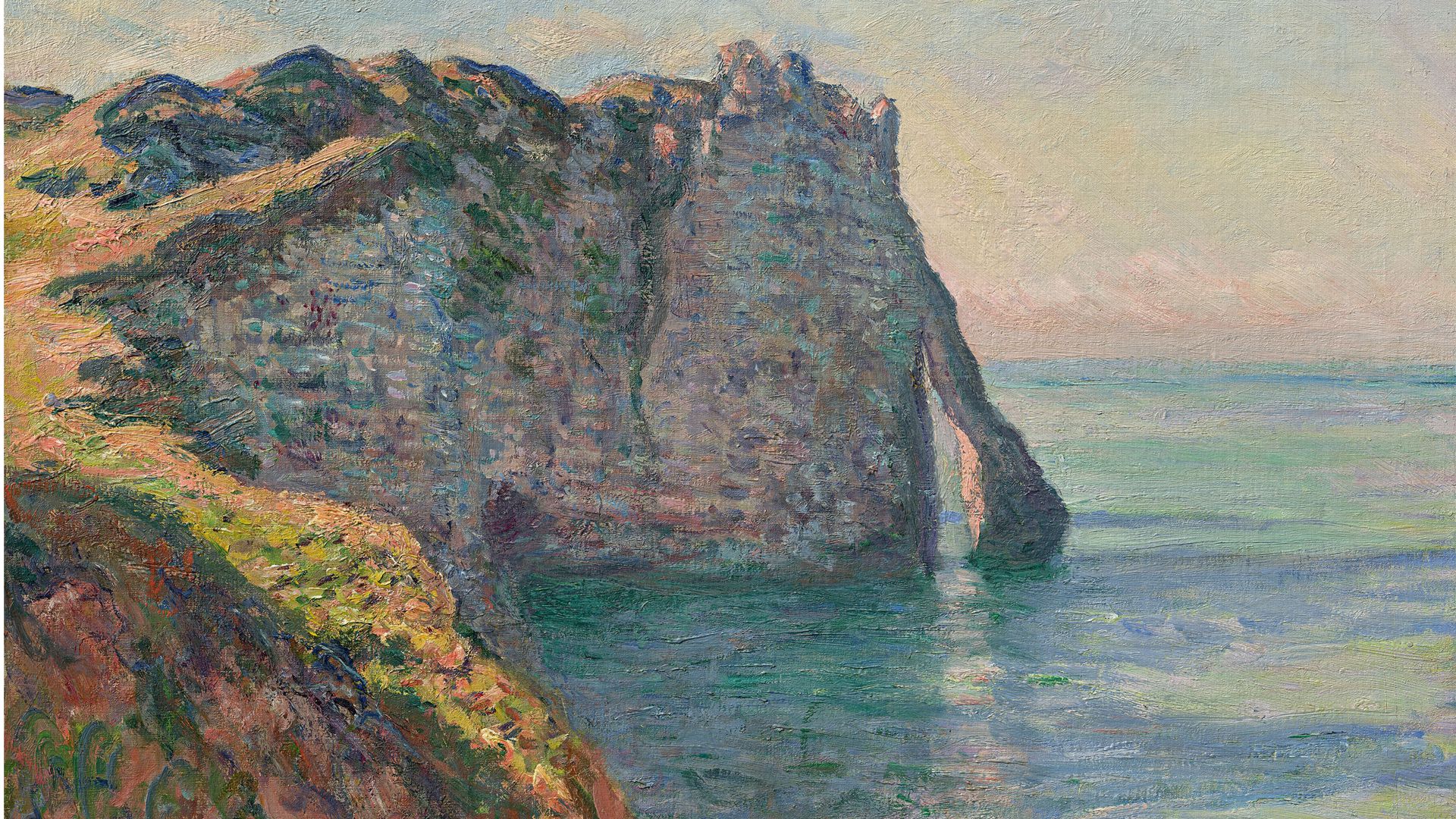 Aber es ist auch wahrlich hochkarätig, was hier zusammengetragen wurde – vor allem von Claude Monet. Er fuhr regelmäßig nach Le Havre und Dieppe, Fécamp und Pourville, am meisten faszinierte ihn aber die raue Küste von Étretat. Nach 1864 kam er regelmäßig, obwohl die Anreise beschwerlich war und bezog ein Zimmer am Strand im Hôtel Blanquet. An die achtzig Werke hat er in Étretat gemalt, auch komplette Motivreihen der Steilküste mit dem Felstor, das mal von wilden Wellen umspült wird, mal friedlich von der Sonne beschienen wird. Dann wieder hängen graue Wolken schwer am Himmel.