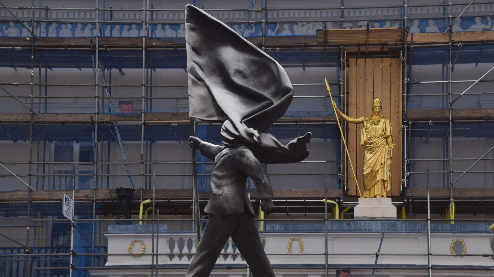 London - Eine plötzlich aufgetauchte Statue im Zentrum Londons sorgt für Aufregung in der Kunst- und Kulturwelt. Die überlebensgroße Figur scheint von einem Podest in den Abgrund zu schreiten, sie trägt eine große Fahne, die ihr ins Gesicht weht. Als Signatur steht am Fuß des Sockels: Banksy. War es wirklich der weltberühmte, mysteriöse Künstler?