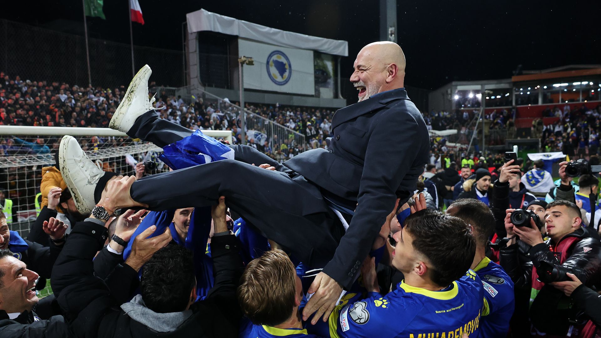 Bosniens Trainer Sergej Barbarez lässt sich nach dem Sieg feiern.Foto: Armin Durgut/AP/dpa