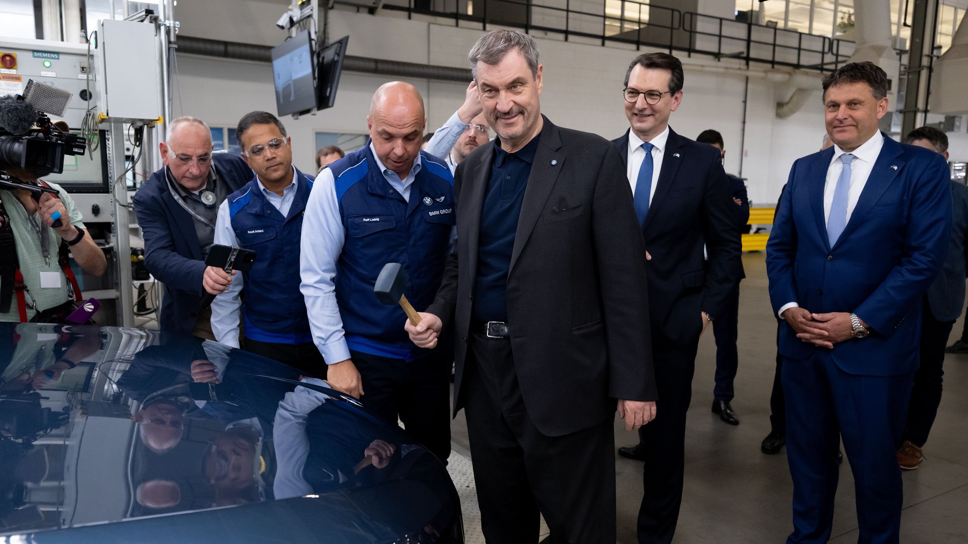 Markus Söder (CSU) bringt mit einem Hammer das BMW-Logo an einem Auto an.Foto: Sven Hoppe/dpa