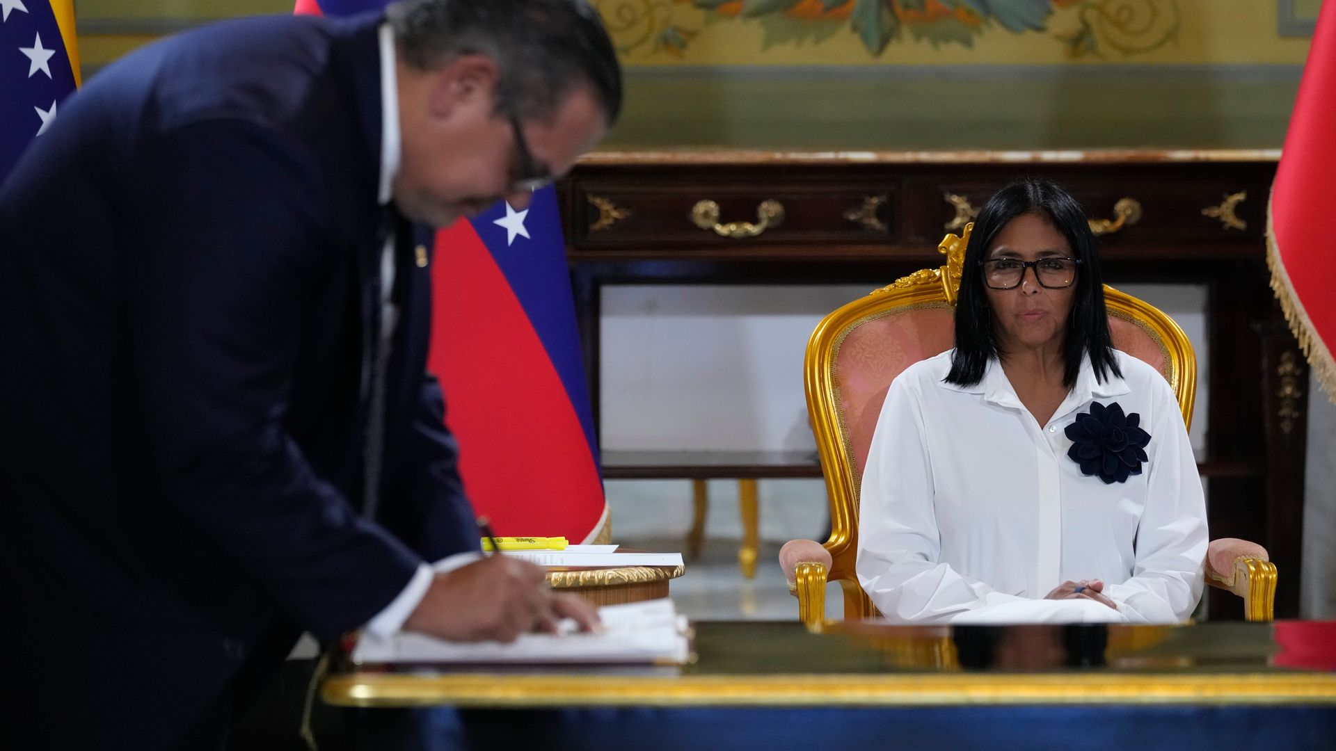 Der Chevron-Vertreter Mariano Vela unterzeichnet ein Abkommen.Foto: Ariana Cubillos/AP/dpa