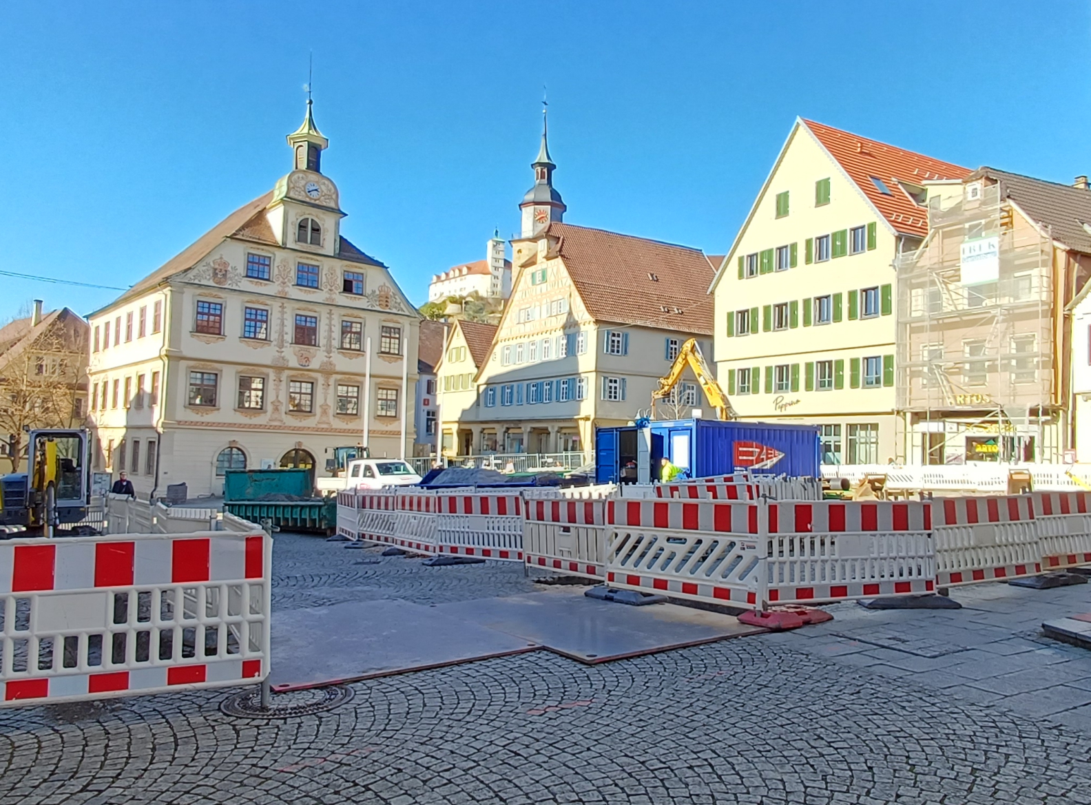 Die Anzahl an Absperrung aufgrund der Umgestaltung dürfte auf dem Vaihinger Marktplatz nun ihren Höhepunkt erreicht haben – aber wer weiß ... Foto: Rücker