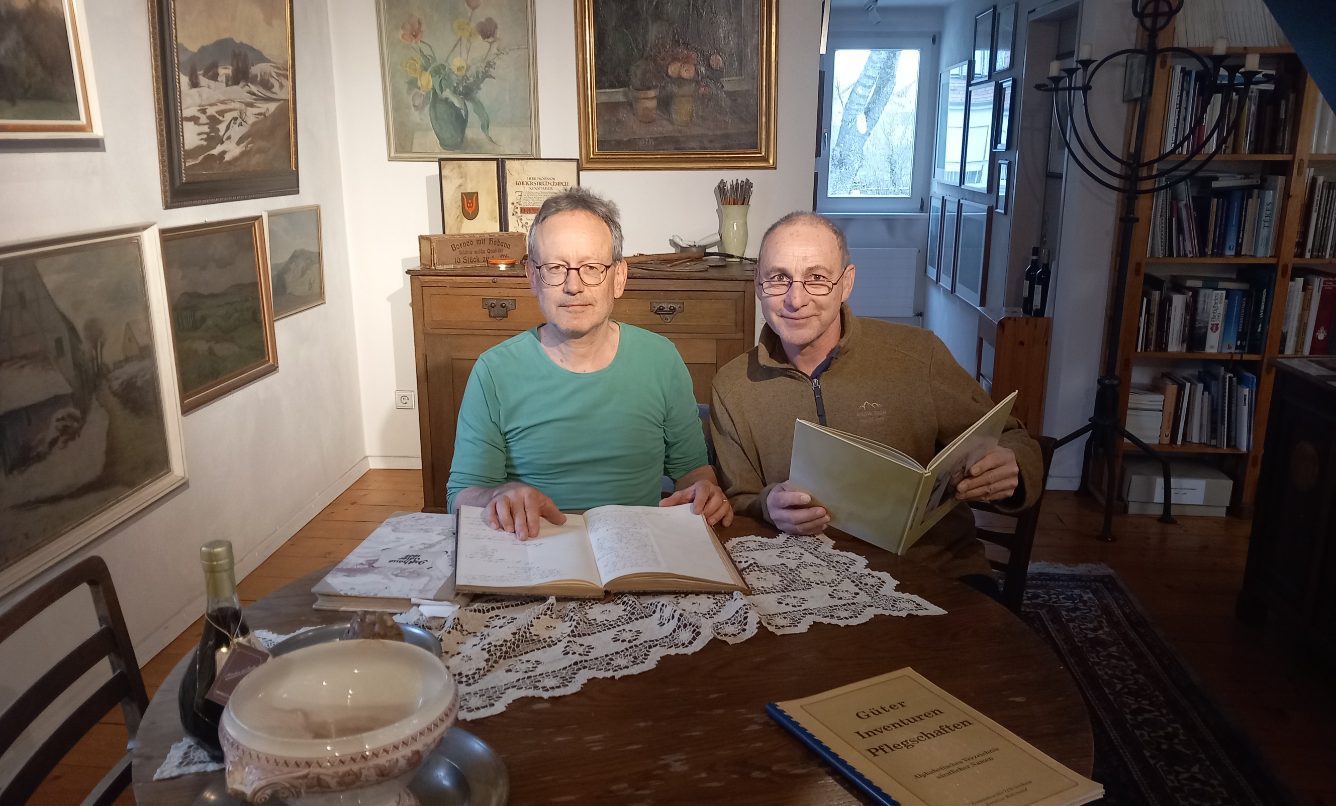 Roland Kögele (l.) und Achim Mozer stöbern in den historischen Büchern im Gemeindearchiv über die Sersheimer Ortsgeschichte. Foto: Glemser