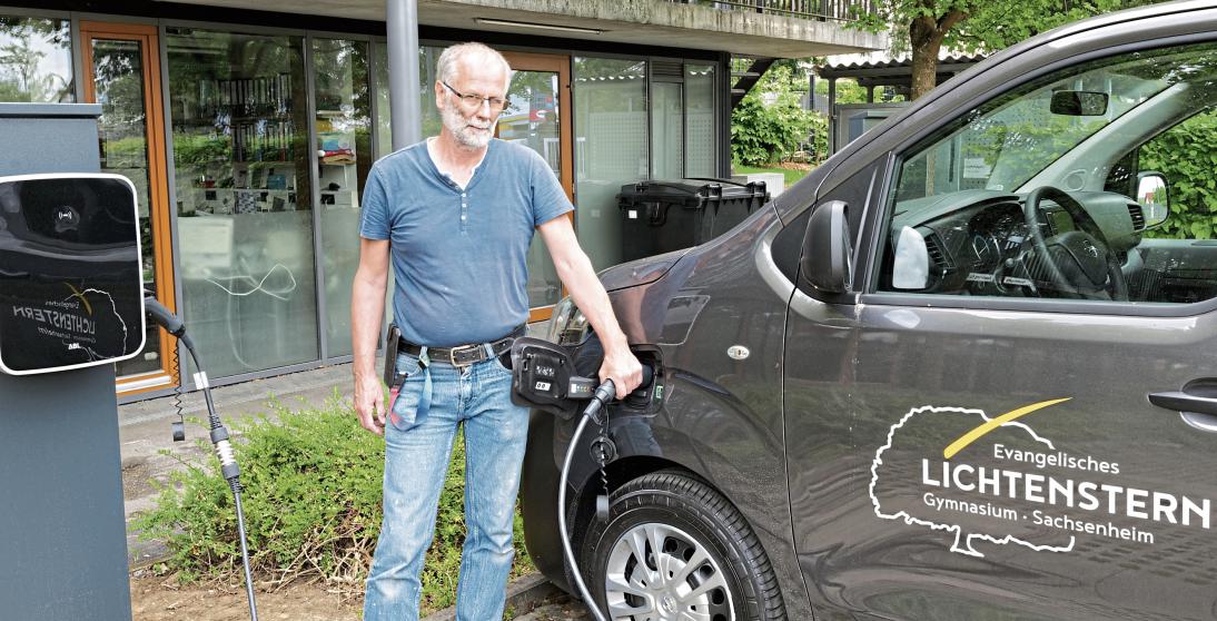 Hausmeister Karl-Heinz Schneider lädt im Sommer den LGS-E-Bus an einem der vier öffentlichen Ladepunkte am Evangelischen Lichtenstern-Gymnasium Sachsenheim. Foto: p