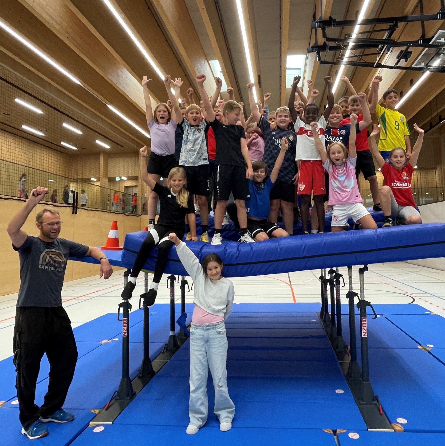 Hoch die Hände: Die Kinder haben beim erlebnispädagogischen Tag in der Kaltensteinhalle offensichtlich eine Menge Spaß. Foto: p
