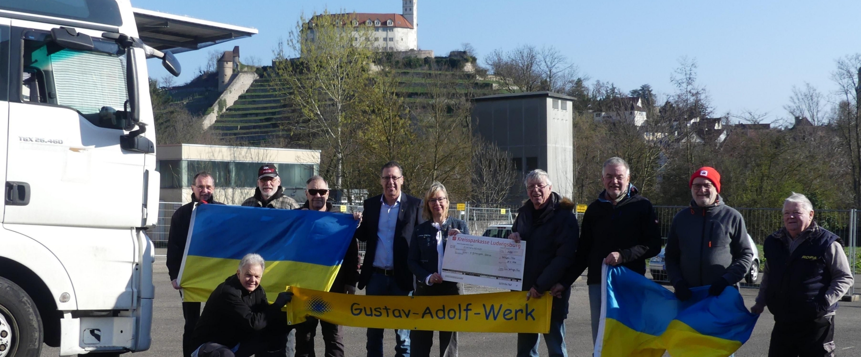 Vaihingen/Sachsenheim (p). Die Übergabe des sympolischen Spendenschecks erfolgte auf dem Gartenschau-Gelände in Vaihingen, wo die Ehrenamtlichen der GAW-Ukraine-Hilfe gerade den fünften Hilfstransport in diesem Jahr beluden.