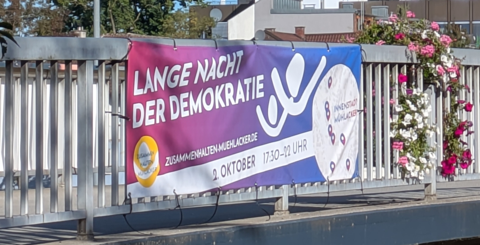 Mühlacker (p). Ein breites Bündnis aus gesellschaftlichen Gruppen, Kirchen, Schulen und Vereinen – unterstützt durch die Stadtverwaltung – veranstaltet am Donnerstag (2. Oktober) die „Lange Nacht der Demokratie“ in Mühlacker. Beginn ist um 17.30 Uhr auf dem Konrad-Adenauer-Platz mit einer…