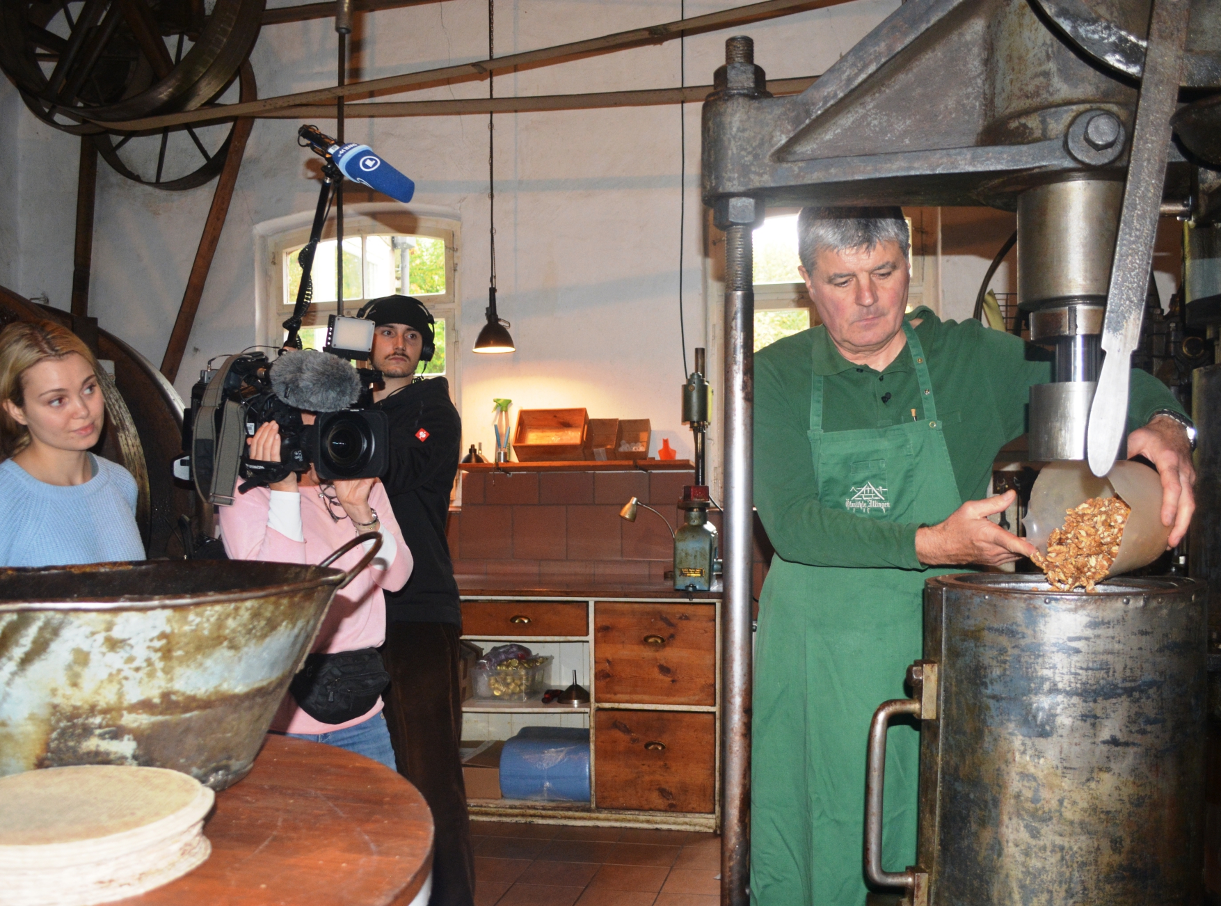 Bei der Arbeit: Der Illinger Ölmüller Jürgen Krauth zeigt einem Fernsehteam des SWR, wie sein Arbeitsalltag aussieht.